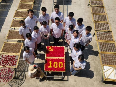 一进村,师生们顶着烈日,前往基地采摘中医药原材料——玫瑰花,经过一番劳作,汗水打湿了他们的头发和衣裳,却也赠与他们丰硕的成果,漫山响起了“唱支山歌给党听”的悠扬歌声,背篓和簸箕都是满满都是玫瑰花,带着这份收获的喜悦,师生们将这份劳动成果,将鲜花拼组成了中国共产党党旗和100周年的画面,鲜花和汗水共同构筑了庆祝中国共产党成立一百周年的喜悦之情。