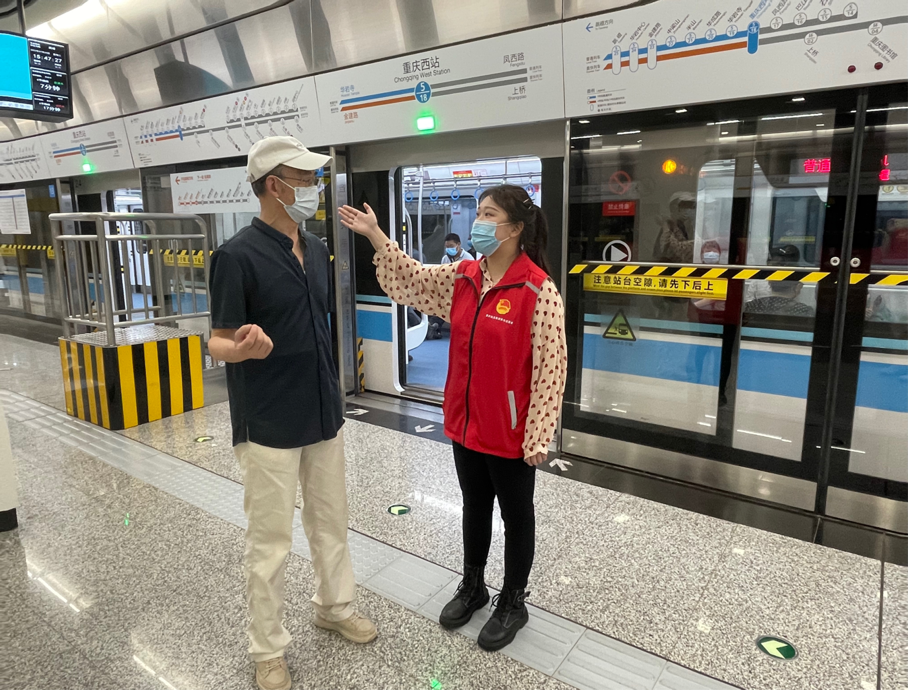 4、帮助老人在自助购票机上完成购票并搀扶进站,在扶梯入口旁提醒乘客注意脚下、带好随身物品等,随站点工作人员一起将重庆轨道交通的服务态度传达给广大乘客。