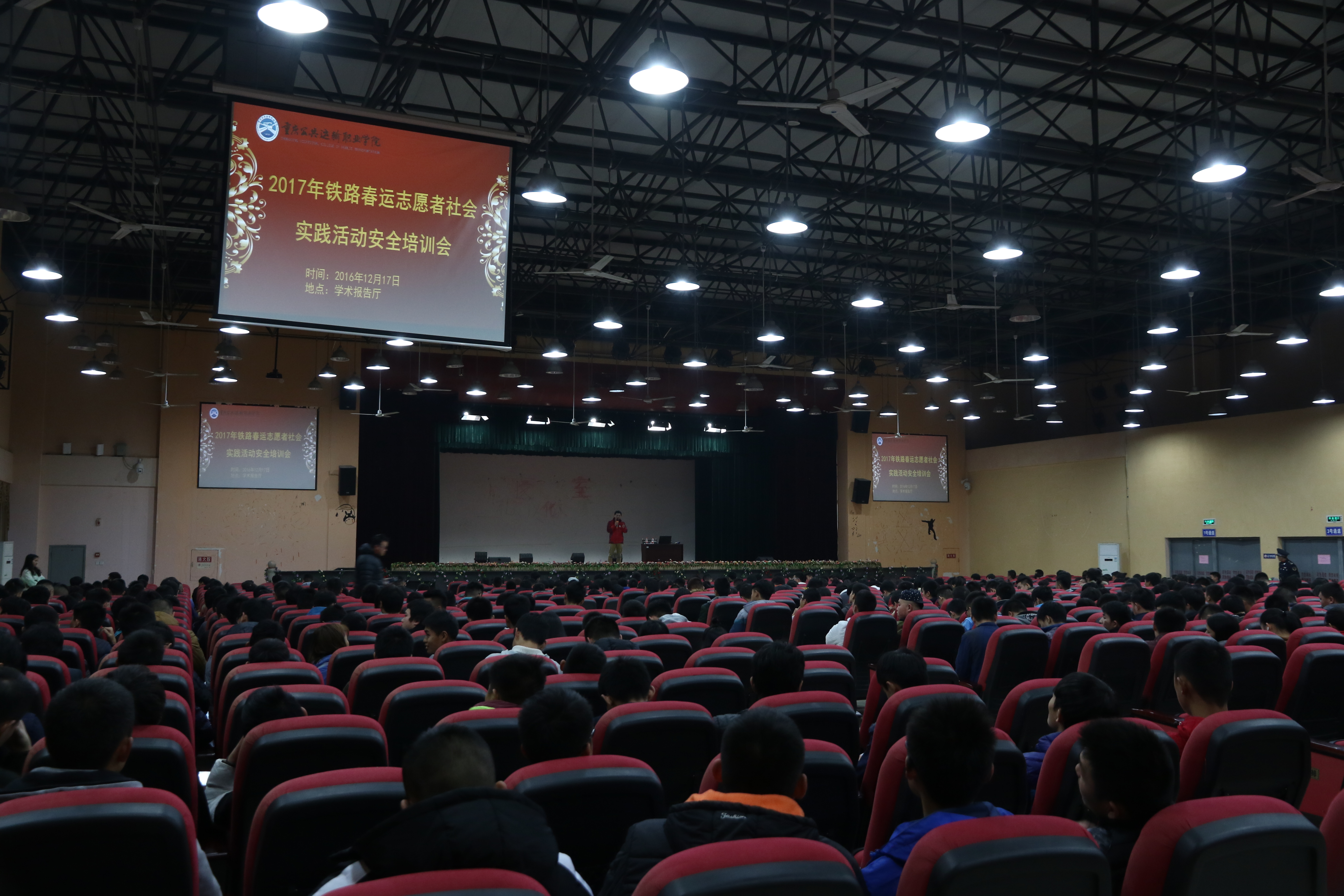 2016年12月17日晚,2017年铁路春运志愿者社会实践活动安全培训会在学术报告厅隆重召开。学院特邀陶老师在学术报告厅为本次参加春运志愿者的同学上了一堂安全知识课。本次安全培训是临行前再次敲响春运安全警钟,主要围绕消防安全、劳动安全、心理安全、防盗遇害安全等方面,旨在提高春运志愿者同学的安全意识。