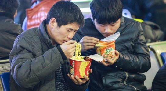 车厢里,总是流传着这样的对联,上联“啤酒饮料矿泉水”、下联“瓜子花生方便面”、横批“脚收一收”。在摩肩接踵的车厢里,旅客们都各好一口。方便面、茶叶蛋等是奔波在春运路上的必备武器,再远的路,再拥挤的车厢,再冷的天,吃一口,就有温度有味道.