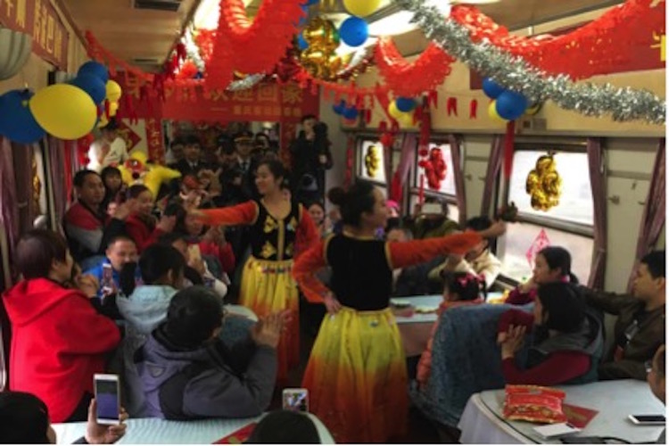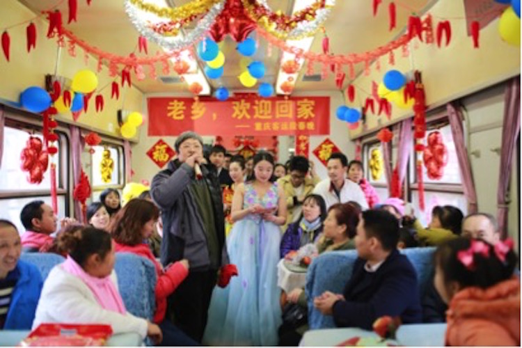 K4214次列车春晚现场张灯结彩、欢天喜地,一首《外面的世界》“我依然等待你的归期”,唱出了无数返乡农民工急切回家的心声;笛、琴共同演绎的《一剪梅》,让我们忘却了冬天的寒冷,感受到了就在最冷、枝头绽放,“看见春天走向你我”;通过击鼓传“花”的传统游戏,分享了2016年最开心的事和2017年的心愿,特别是当刘院长代表我院为幸运儿送出的祝福,让整个车厢的旅客感受到了我院强烈的社会责任感;《欢乐中国年》舞蹈,直接把整个春晚推向了高潮,整个车厢欢歌笑声连成片,中国年年味浓浓;《重庆欢迎你》,表达了本次列车所有工作人员贴心、热情的服务将每个旅客平安地送达至终点站,也是春节幸福团圆起点站的祝福。