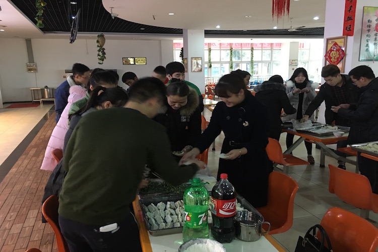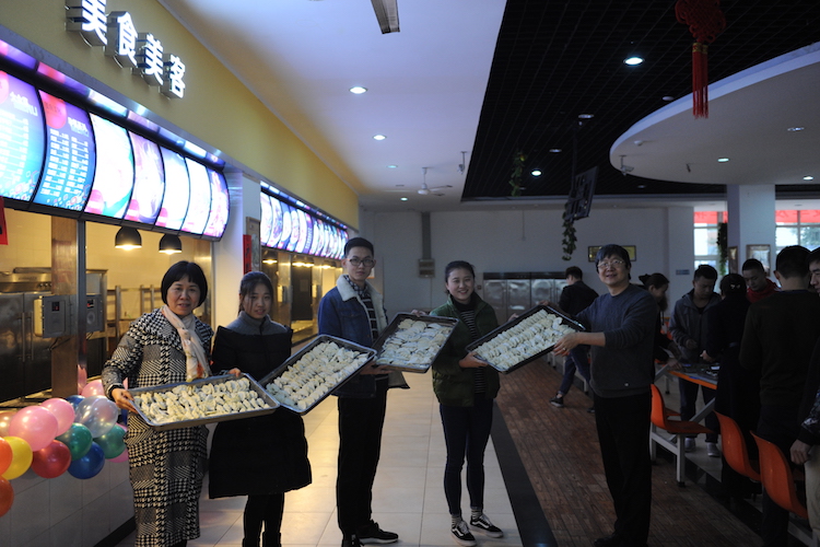 炮竹声声辞旧岁,2017年1月26日,学院党委书记彭超、副院长刘畅代表学院党政领导在学院食堂一楼同春节期间留校的40余名学生包饺子、贺新年。学生处处长刘妮娅、安保处安保科长杨华、就业服务中心主任陈香、团委副书记彭余、大正物业张燕经理及在校值班老师们。