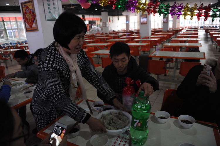 饺子新鲜出炉了,彭书记为同学们端上饺子
