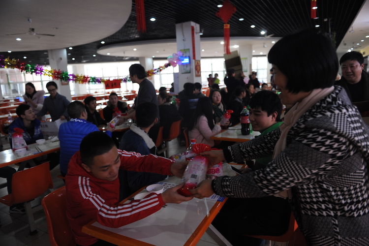 经过一个小时的努力,十几盘形态各异的饺子在师生的欢声笑语中完成了,不一会儿,饺子新鲜出炉,师生们分十八桌坐席,俨然一顿别开生面的年夜饭,除饺子外,还有美味的新鲜菜肴与饮料,同学们吃得津津有味。饭后茶余,彭书记、刘院长为同学们亲手送上学院的慰问品恭贺新年。