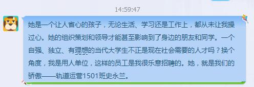 今年的春运志愿者,让她的大学生活更加忙碌,但是看到她的成长,我相信不仅是她的辅导员,每一个老师都是感到欣慰的,因为公运有如此优秀的学生。每一个学生心中也是荡漾的,因为她的大学,是很多人理想的大学。