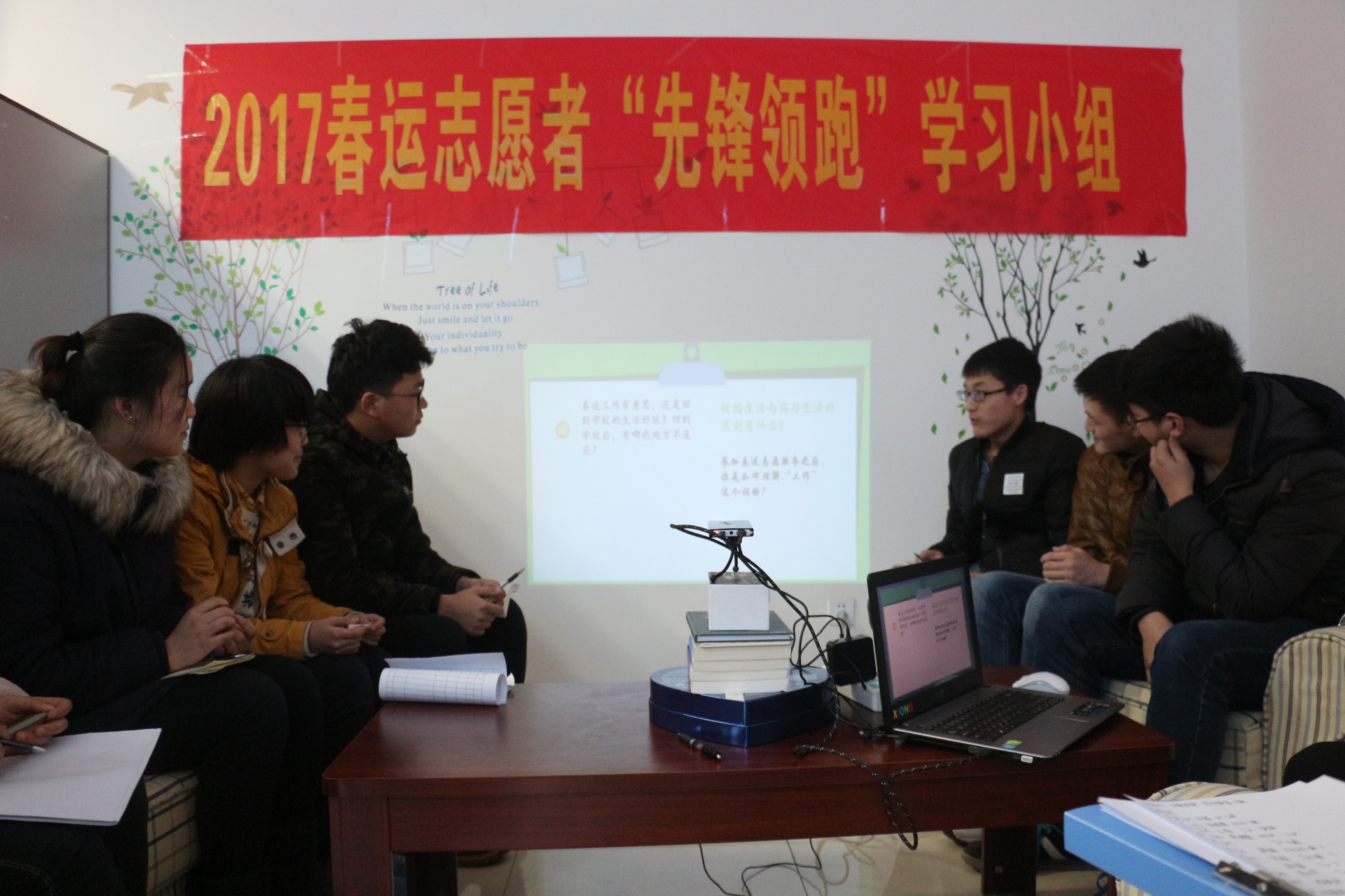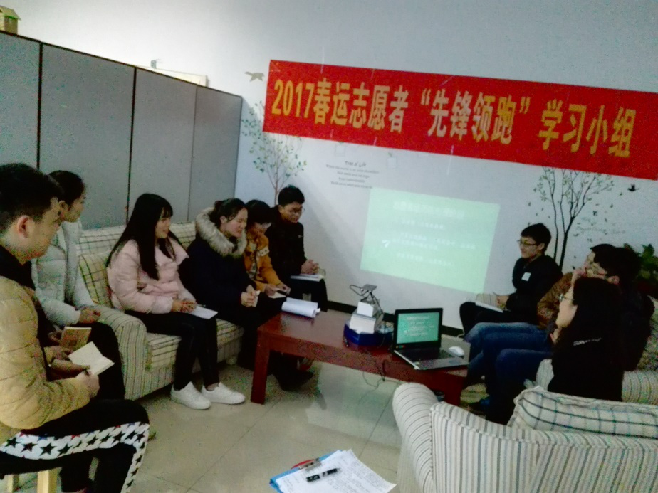 2017年3月15日下午2点30分,在教学楼A202,10名春运志愿者在老师的带领下开展了以“回归校园,用心生活”为主题的学习小组活动。