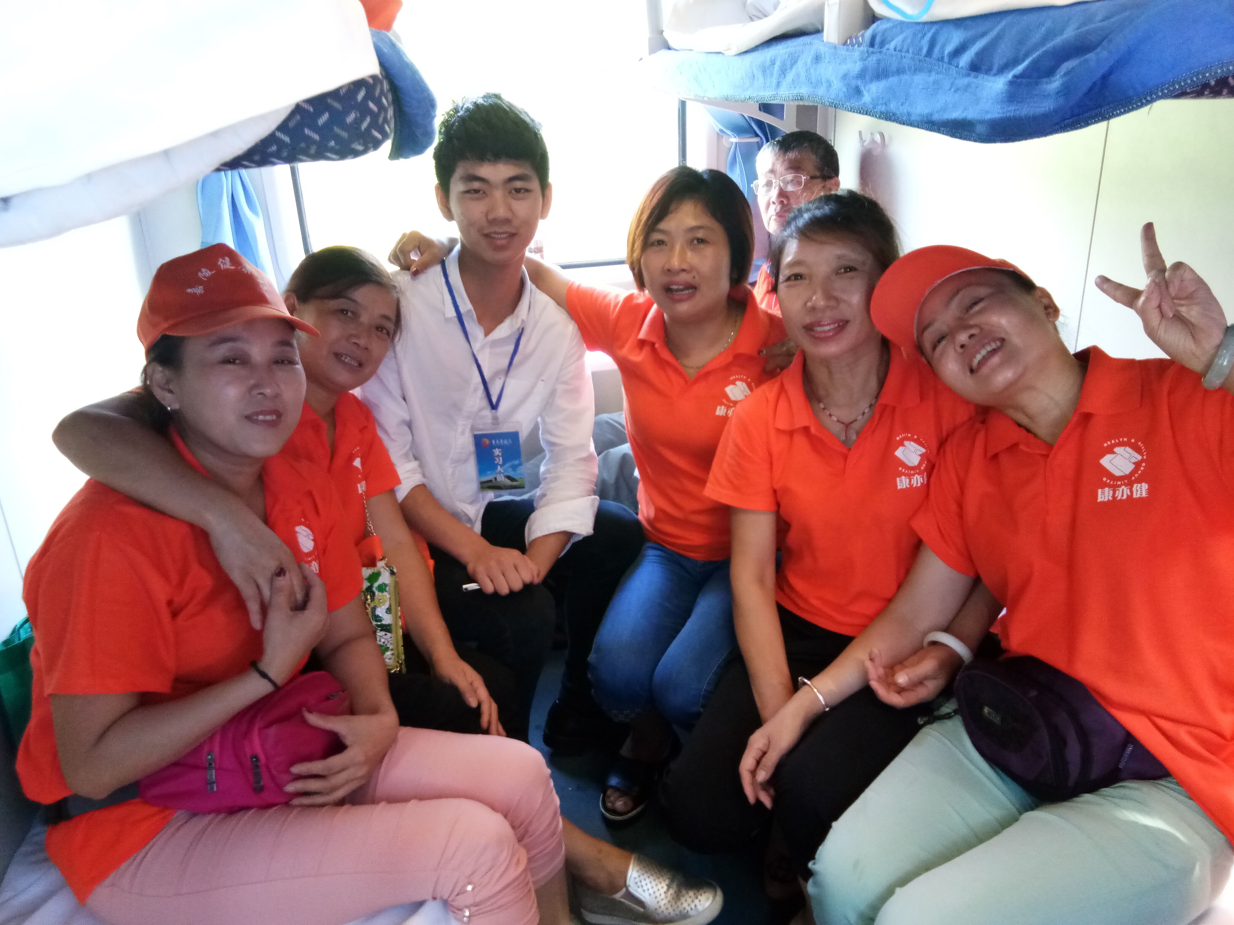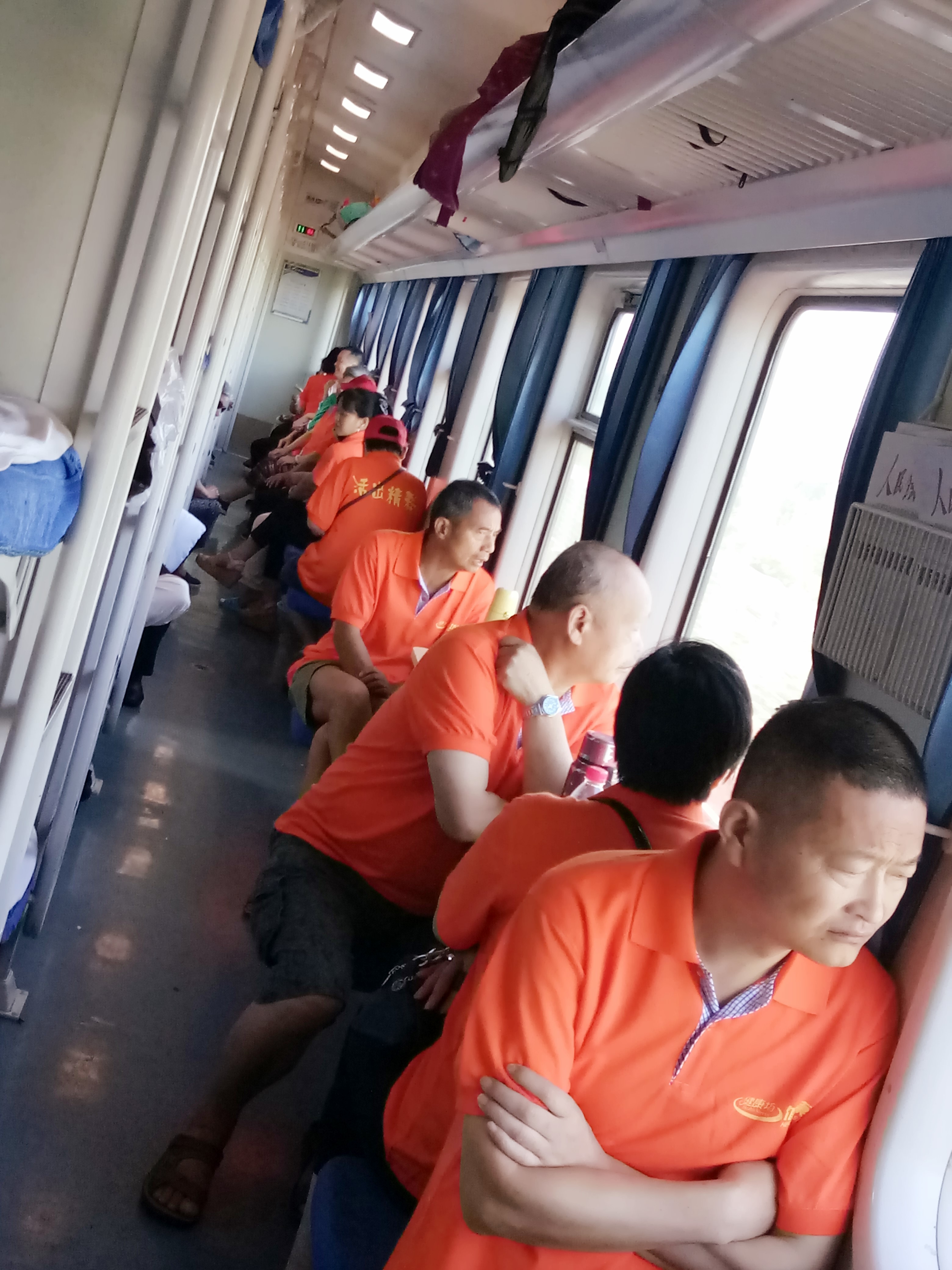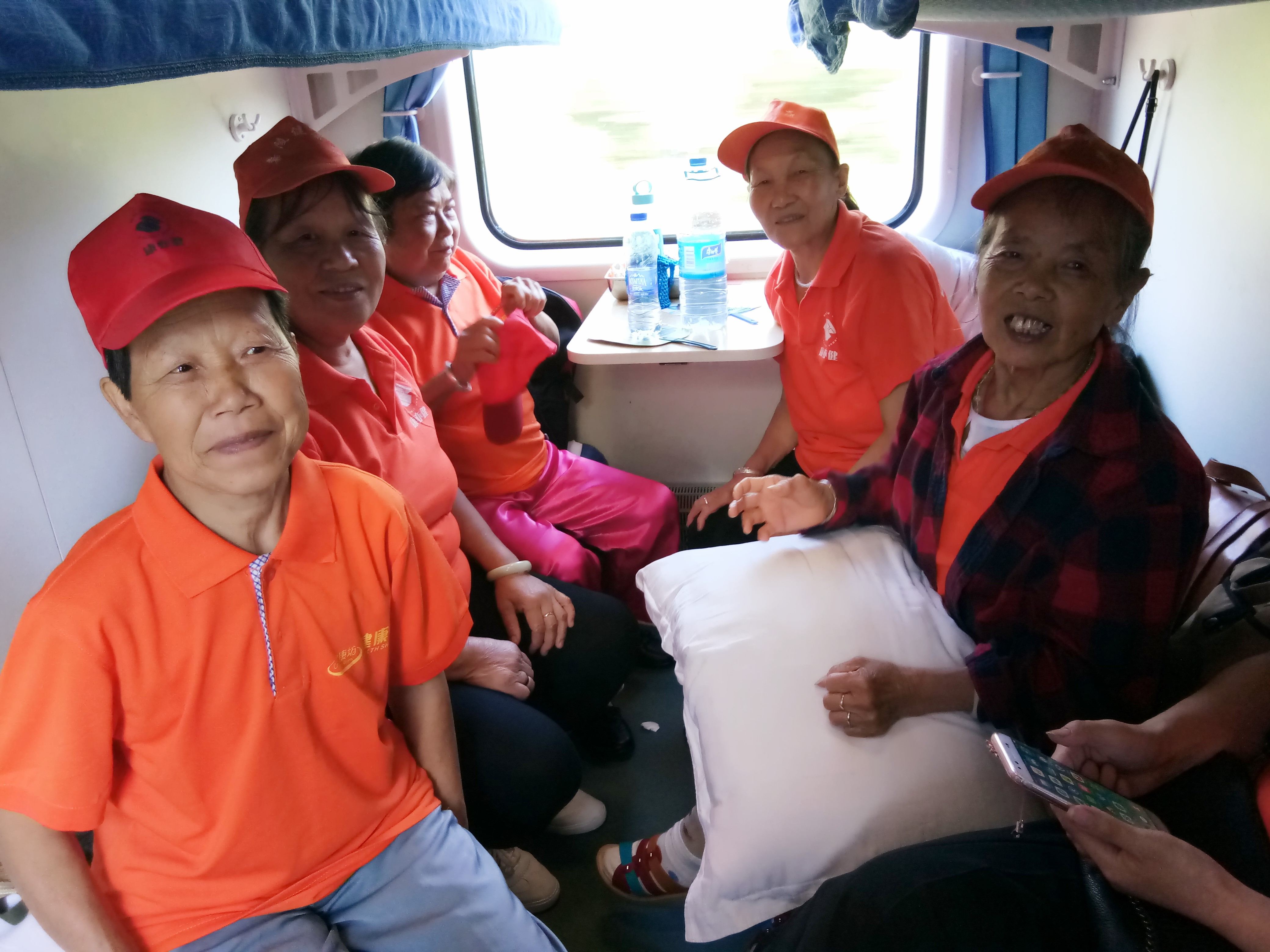 这一次我们幸运的遇到一个老年旅游团,前往广州旅游,从12车厢走到15节车厢都是青一色的服装,那是他们结伴同行的标志。