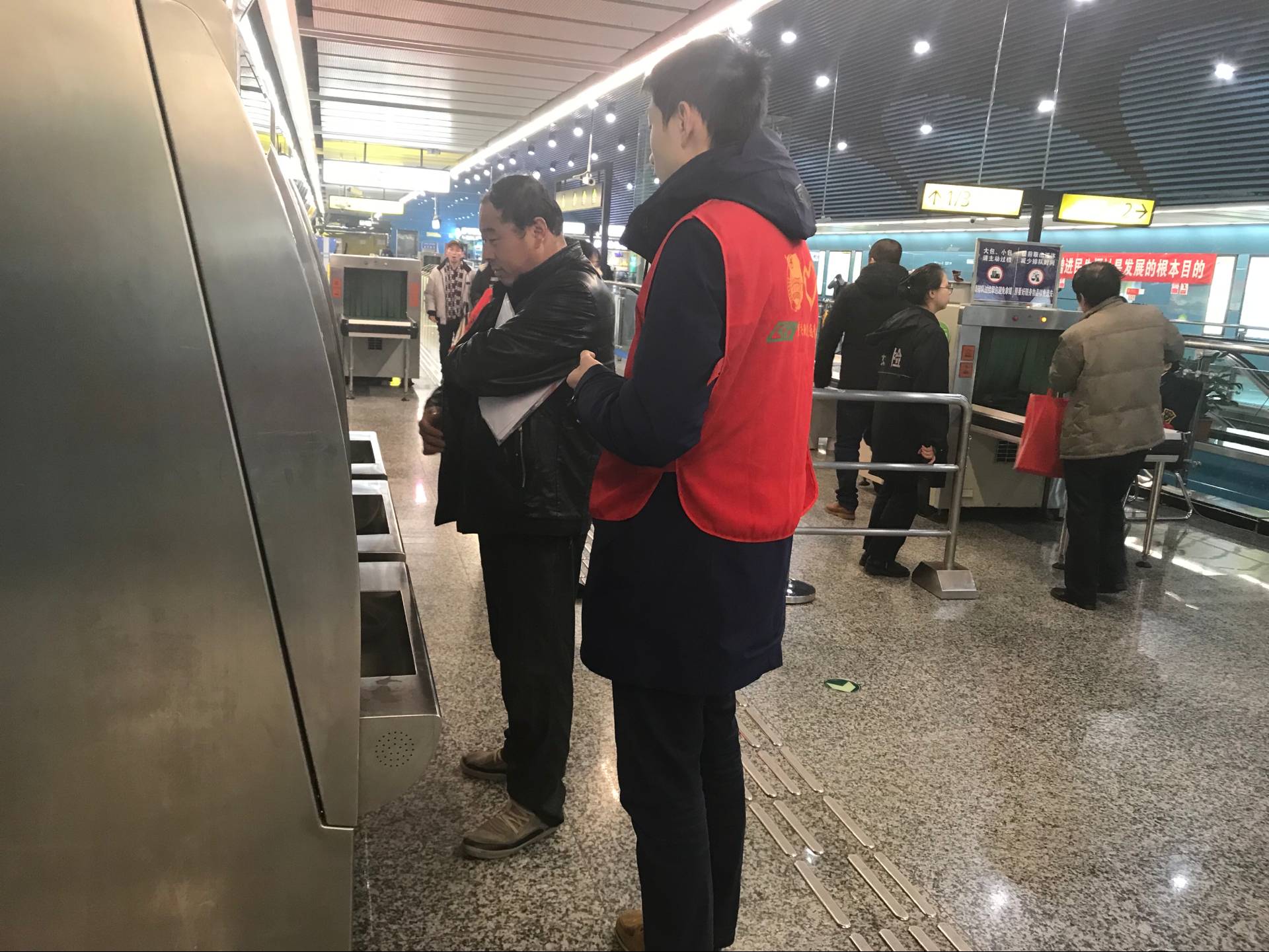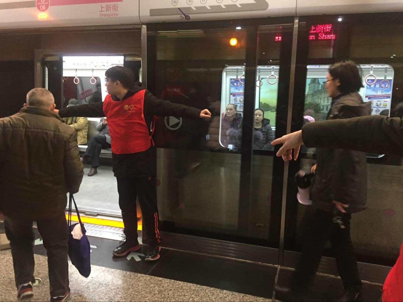 在轨道服务的志愿者们,早早起床,赶在人流高峰之前准备好应有事项。在高峰人流来袭之时,红马甲志愿者就好像洪流中的航标船,即使被人流左推右挤,仍能做好轨道交通、轨道安全的引导者。
