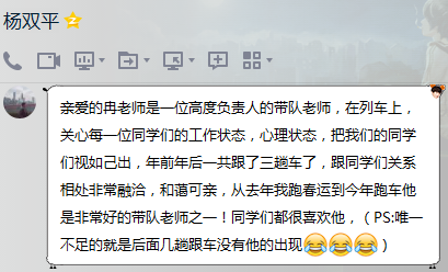 两次参加春运,一次参加暑运的杨双平同学,对冉凌老师的付出看在眼里,记在心里: