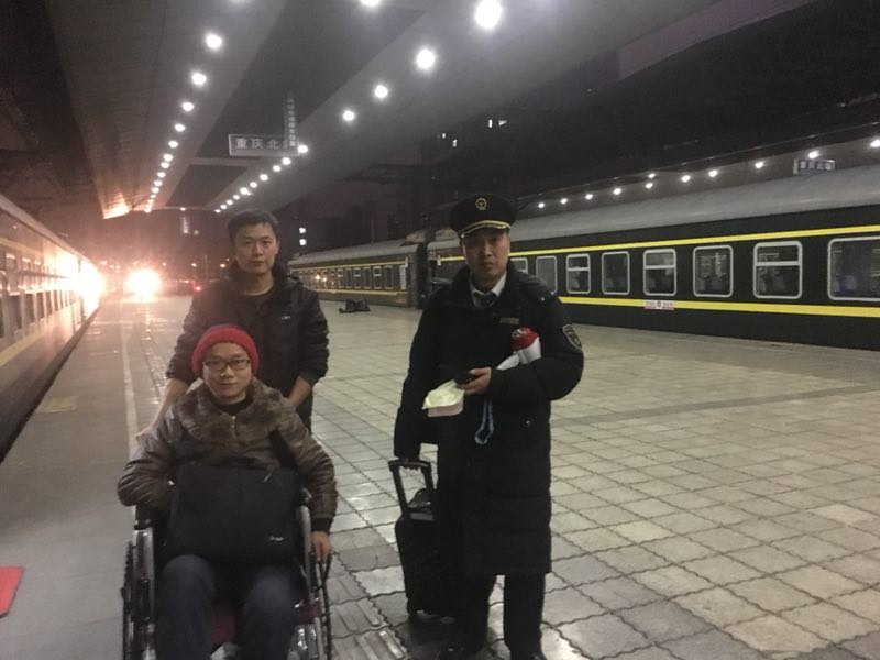 2月23日,重庆客运段北京车队K4389-1组,先套跑达州,然后回重庆北前往福州。在达州站台,列车长朱小平和春运带队教师冉凌,看见一位坐着轮椅的乘客,随即上前关心询问。