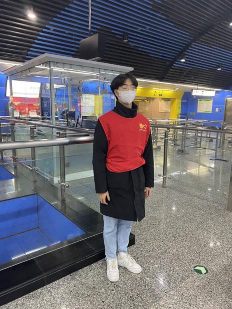 在这次红马甲志愿服务活动中,感受到志愿者不仅在于帮助他人,给他人带来温暖,自己还能学到很多东西。每天我都站在同一个地方,做着同样的事,说着同样的话。在这里我们每天可以接触形形色色的人,有些年迈的老人可能腿脚不方便,我能为他们做的便是引导他们出站,为他们指路,帮他们处理票卡问题。他们都会说一句:“麻烦你了”,虽然这些事情看起来很平凡,却让我在这个寒冬倍感温暖。