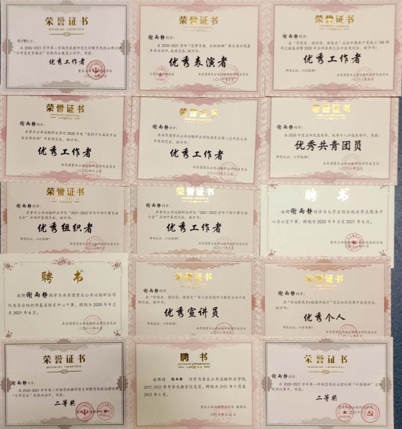 她曾多次参加学校组织的党史相关活动,以提高自身政治思想意识,服务意识。她曾在学习委员、校团委组织部干事等岗位中不断学习、进步,如今已经成长,担任校团委学生副书记。