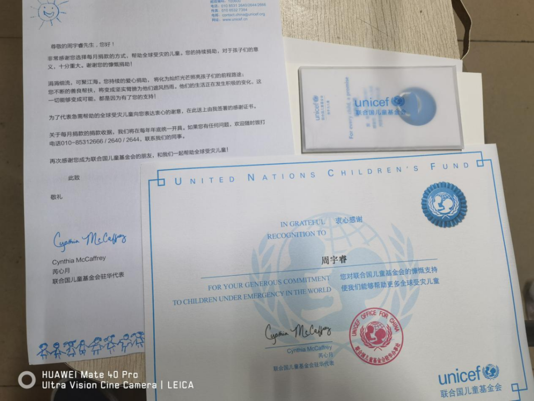 16.2021年10月至今通过月捐款方式向联合国儿童基金会进行捐助,帮助全球受灾儿童,获得一份来自联合国儿童基金会的《感谢证书》
