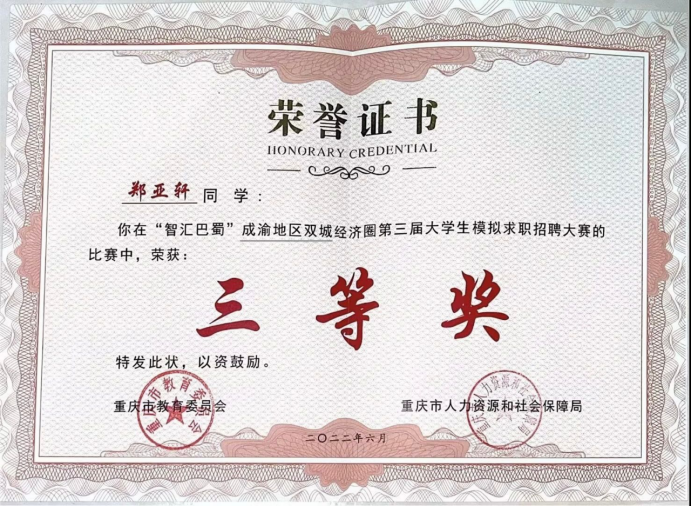 工作上,她曾担任校团委学生副书记一职,曾参与“2021迎新志愿者”工作筹备。“2021国庆长江索道、车站社会实践”后勤保障。她累计志愿服务时长380小时。有过6次社会实践经历并多次担任组长,荣获社会实践优秀个人。在班级,她担任文艺委员,多次参与筹办主题班会并获优秀奖。