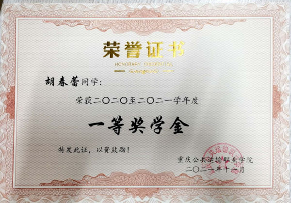 她保持两年专业成绩与素质积分排名专业第一的好成绩,并连续两年荣获国家奖学金。曾获校级一等奖学金、单科奖学金,并且考取通过城市轨道交通站务职业技能证书、工业和信息化人才评价证书等证书。学习之余,她还参加了绚丽年华第十四届全国美育教学成果展评、全国大学生组织管理能力竞技活动等30余比赛和活动,并取得了各类奖项和证书。