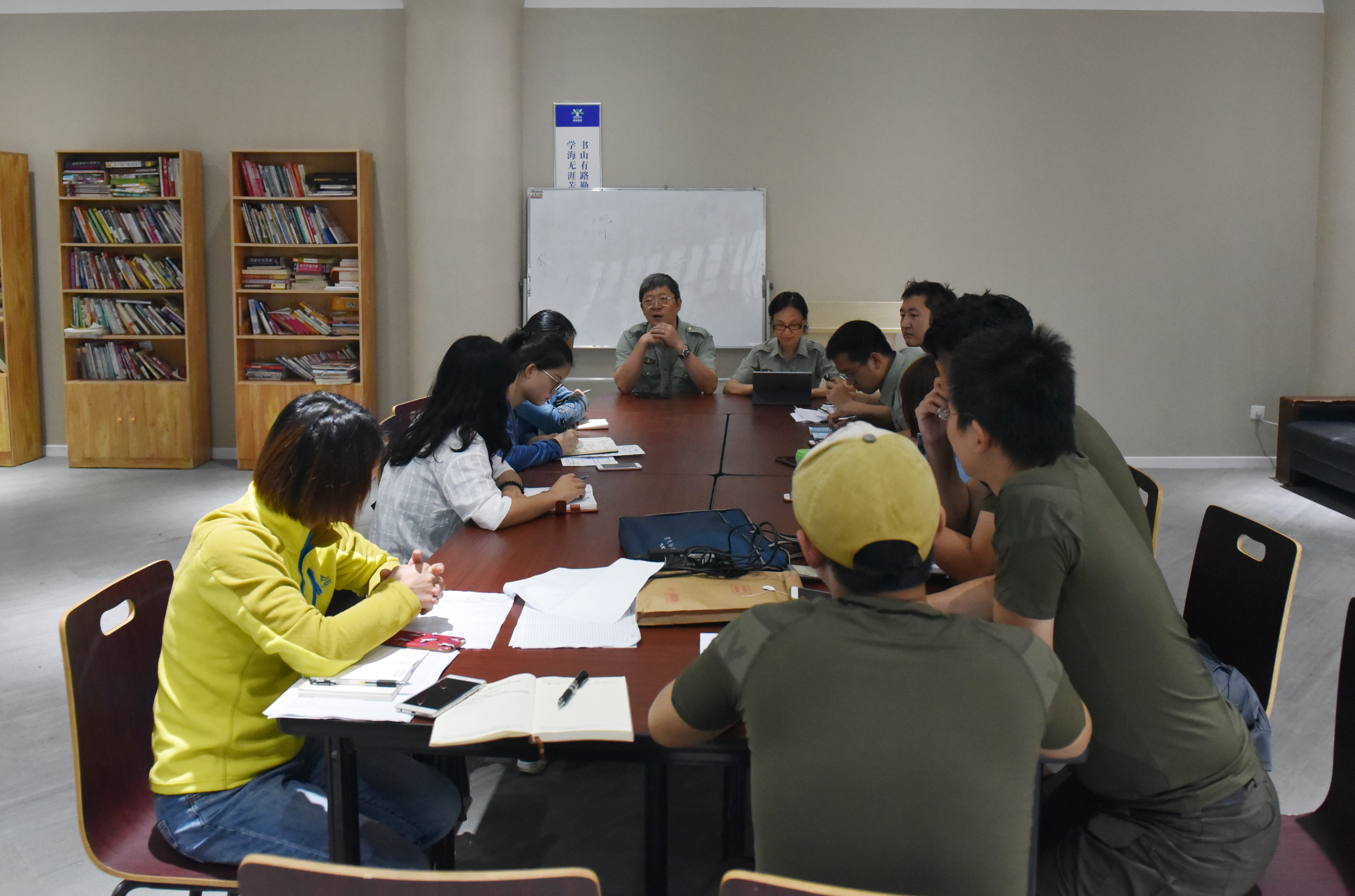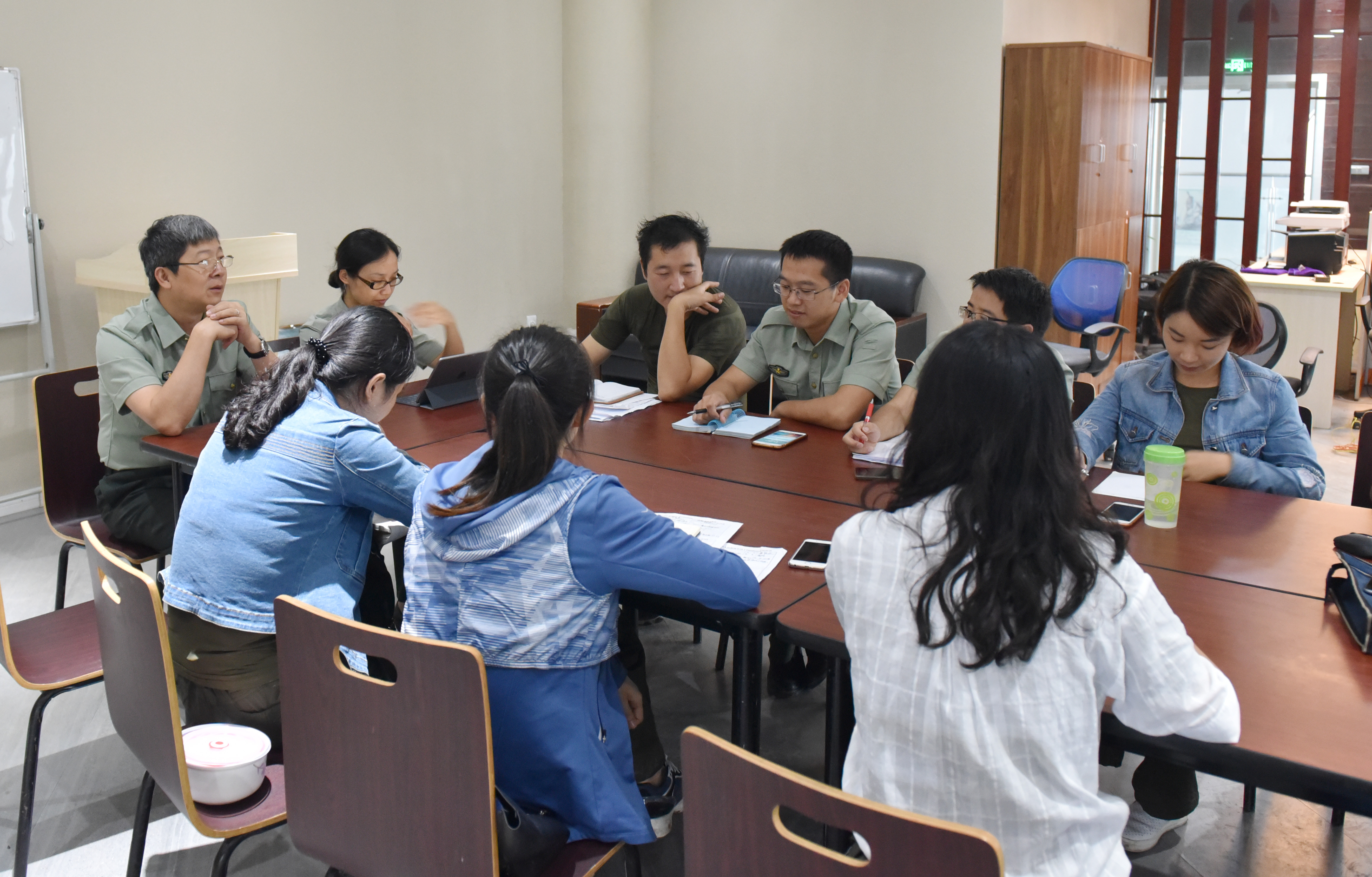 会议在新搭建的会议桌上进行,刘院长表示已经与两边基地进行了确切沟通,切实保障学生的食品质量和数量,以及安全卫生问题。针对古剑山基地男女寝室分布问题、厕所问题,会上进行了讨论,各指导员根据掌握连队的实际情况进行了分析,讨论决定对部分宿舍进行内部调整,同时拟定在寝室楼设定公用卫生间,最大程度上保证同学们的生活需求。