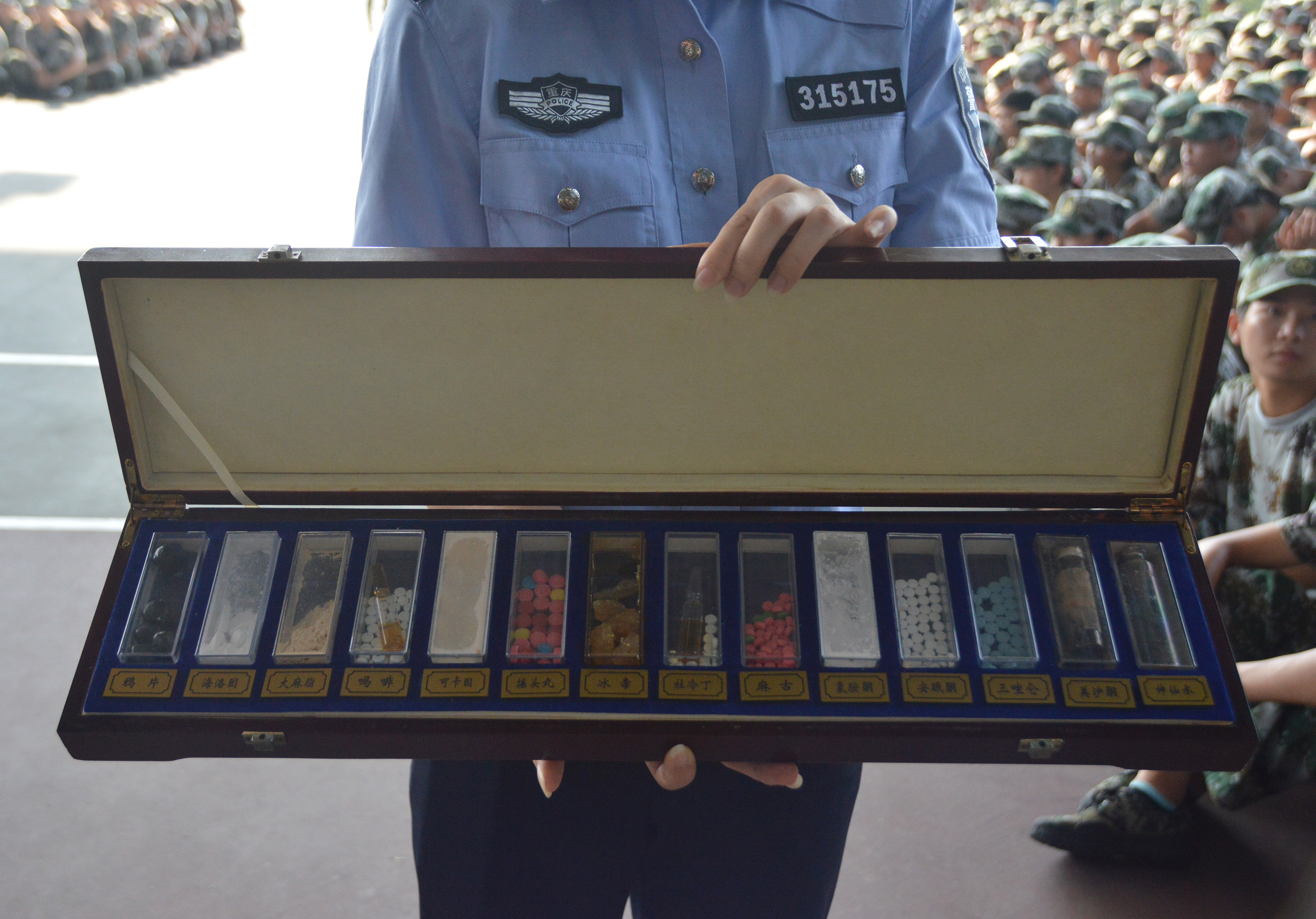 活动穿插了禁毒挂图宣传展示、仿真毒品展示等形式来宣传毒品的危害,警官拿着毒品样品一一为同学们细细讲解毒品的种类,并且告诉同学们如何防范他人下毒。
