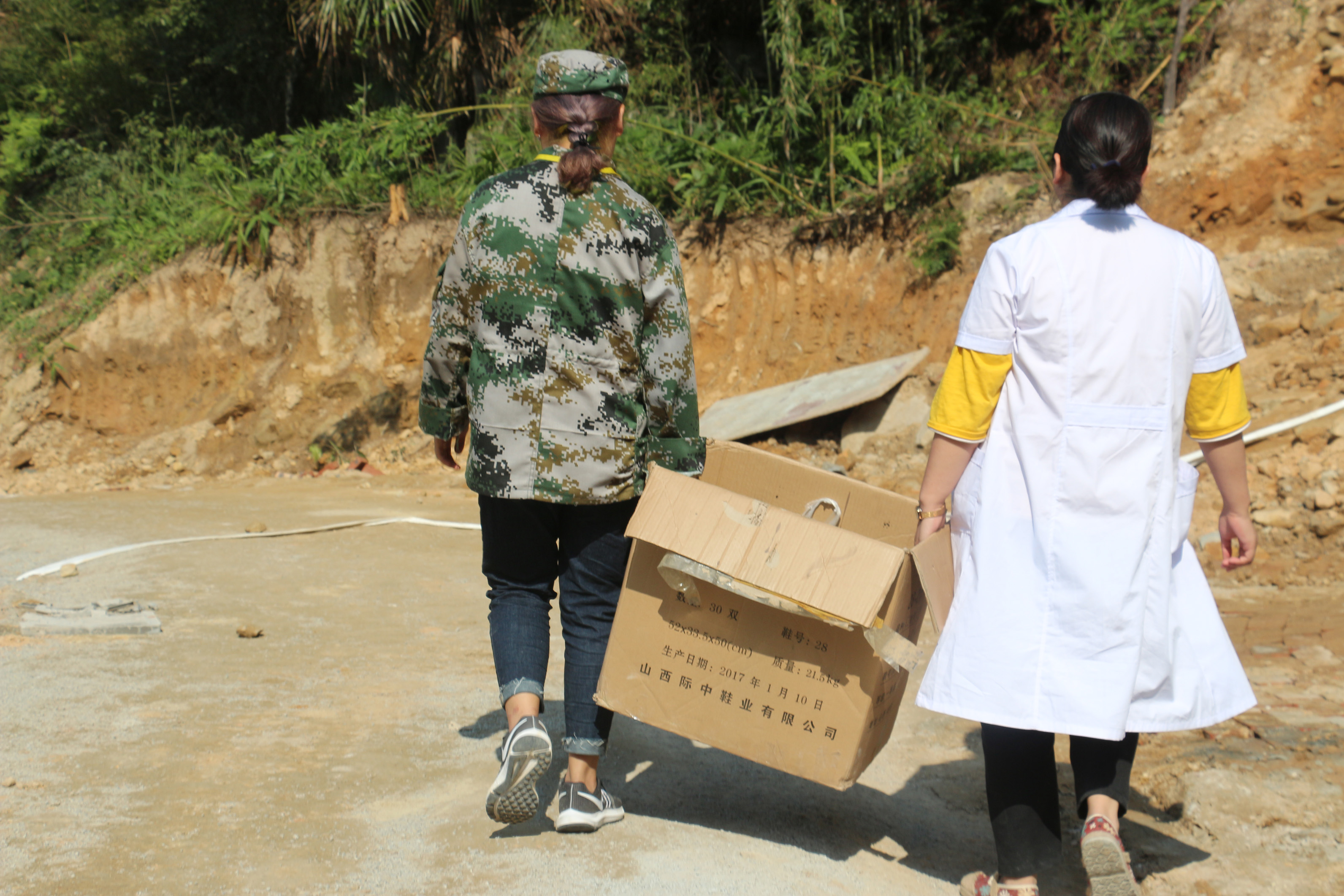 当医疗人员来到基地,同学们都十分积极地上去提东西。