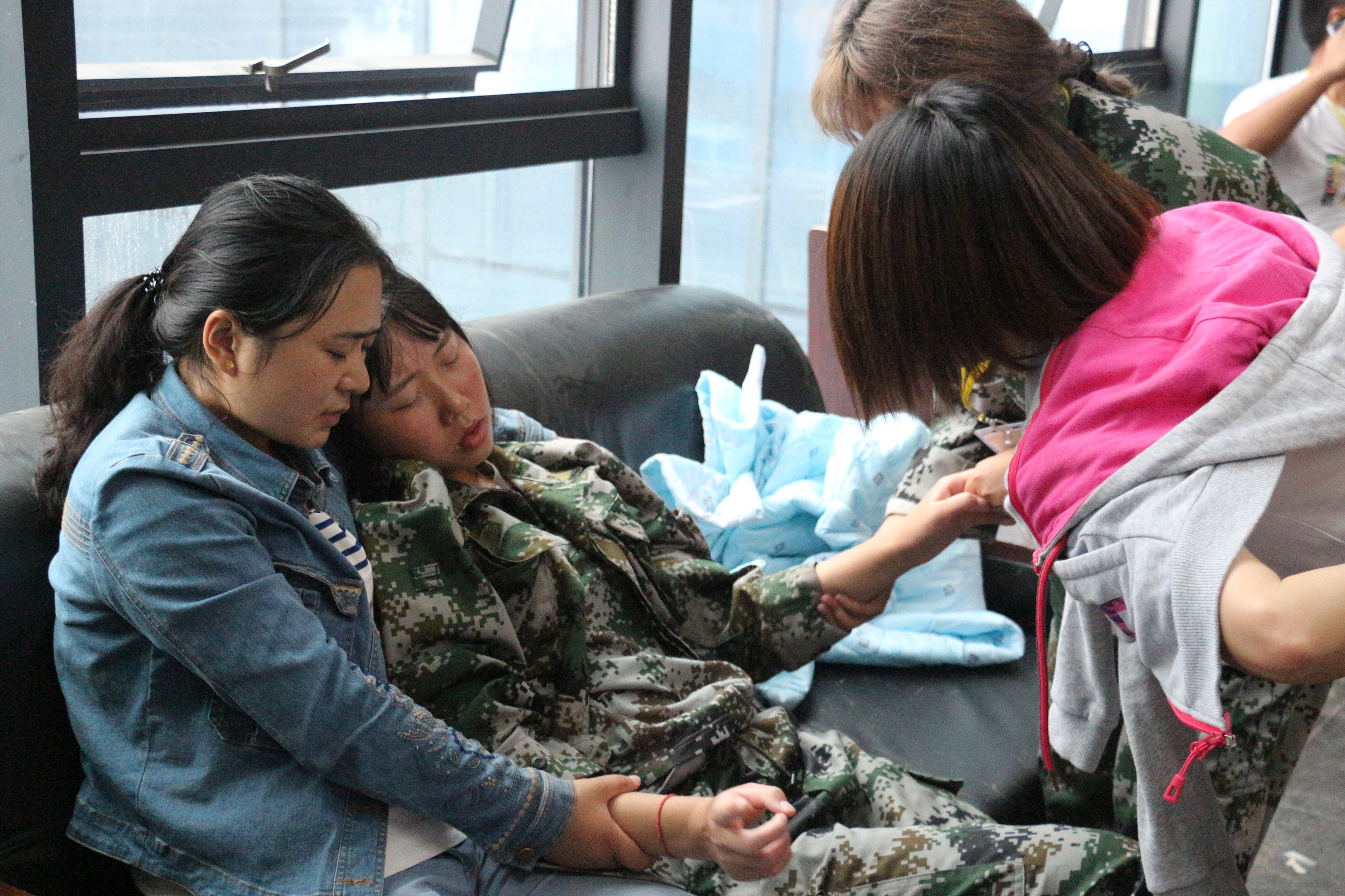 就在18日晚上,突发情况又发生了。31连的刘同学生病了,疼痛的厉害,同连队的龚应琼与陈俊良同学从训练场地一路背着刘同学到医务室。刘副院长着急打医生电话为学生就诊,刘处长、辅导员陈香姑老师细心照顾,喂同学喝热水,其他老师在从旁协助和关心;后医生诊断要立即送医,苏健康老师和同学连扶带背,将学生寝室物件取好,把刘同学送到车上。潘宏老师、陈香姑辅导员协同龚同学,将学生送往医院就医,深夜十一点多才回基地。在 大家的忙活下,刘同学身体总算无大恙,这也是大家所期望的结果。