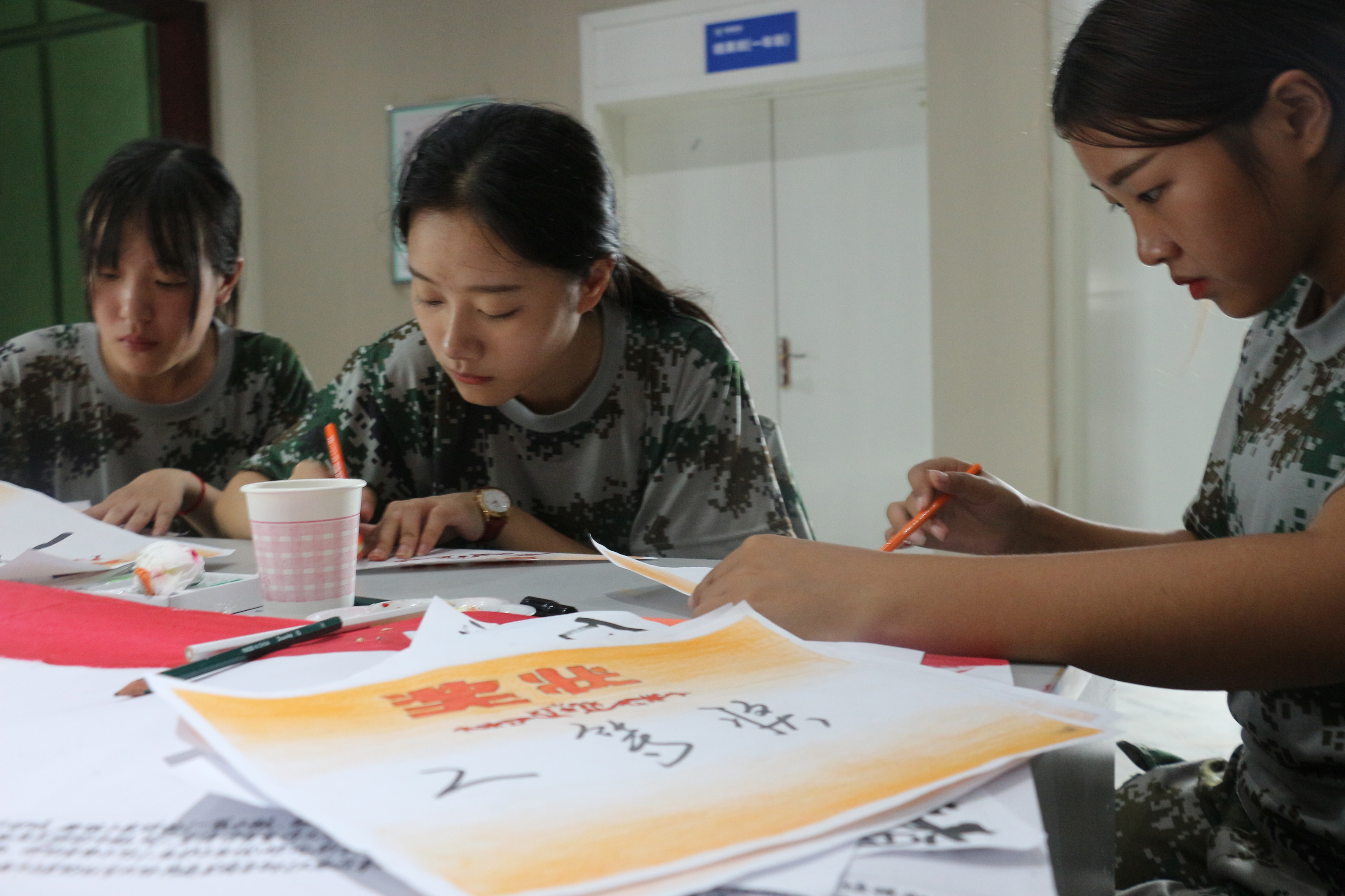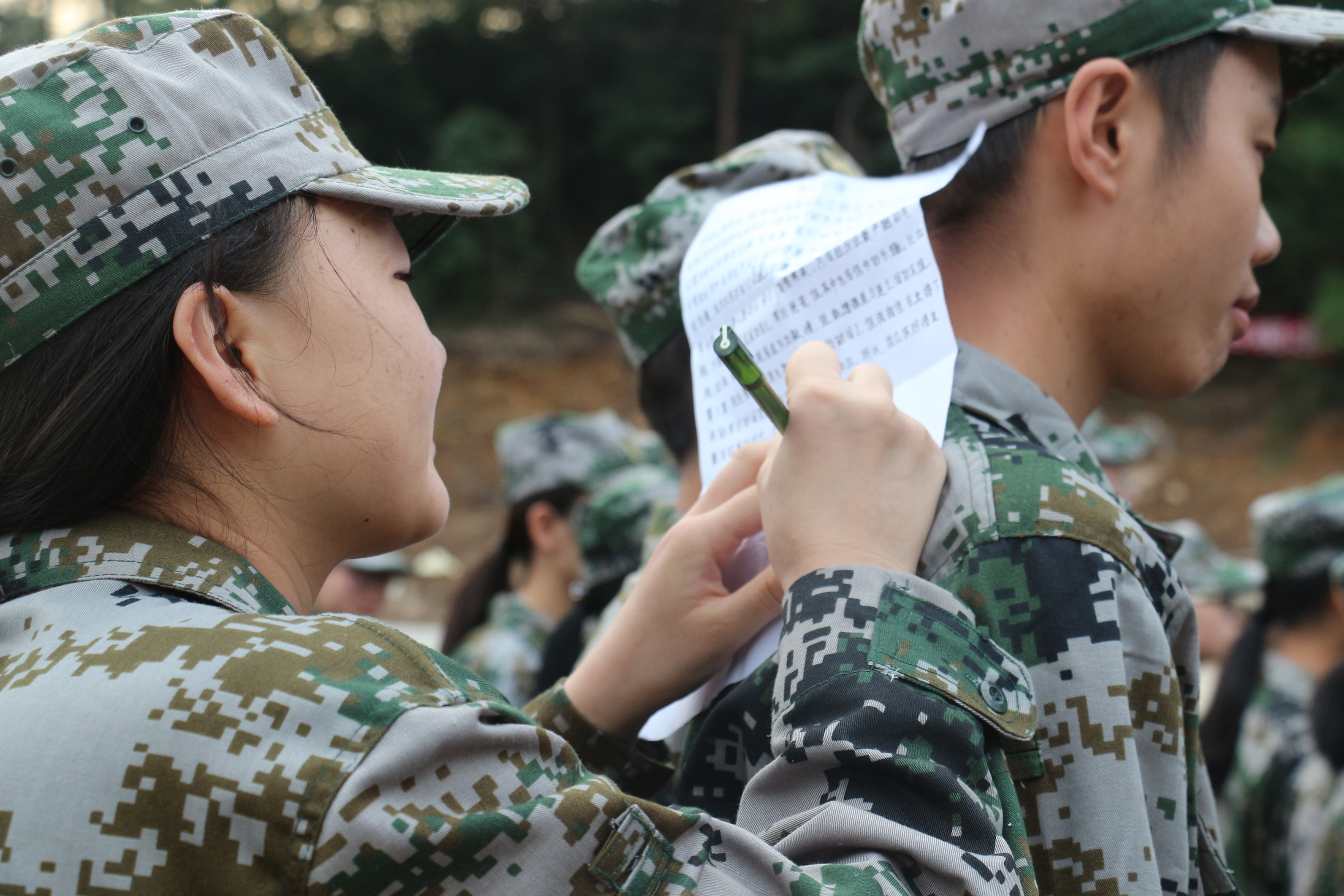 在训练时没有桌子写字时,有同学会把自己的背当做桌子,让同学能够平稳的写。