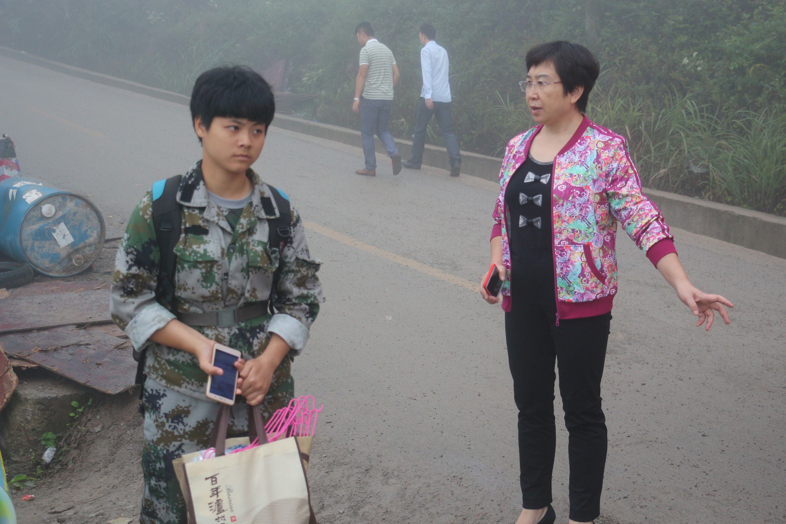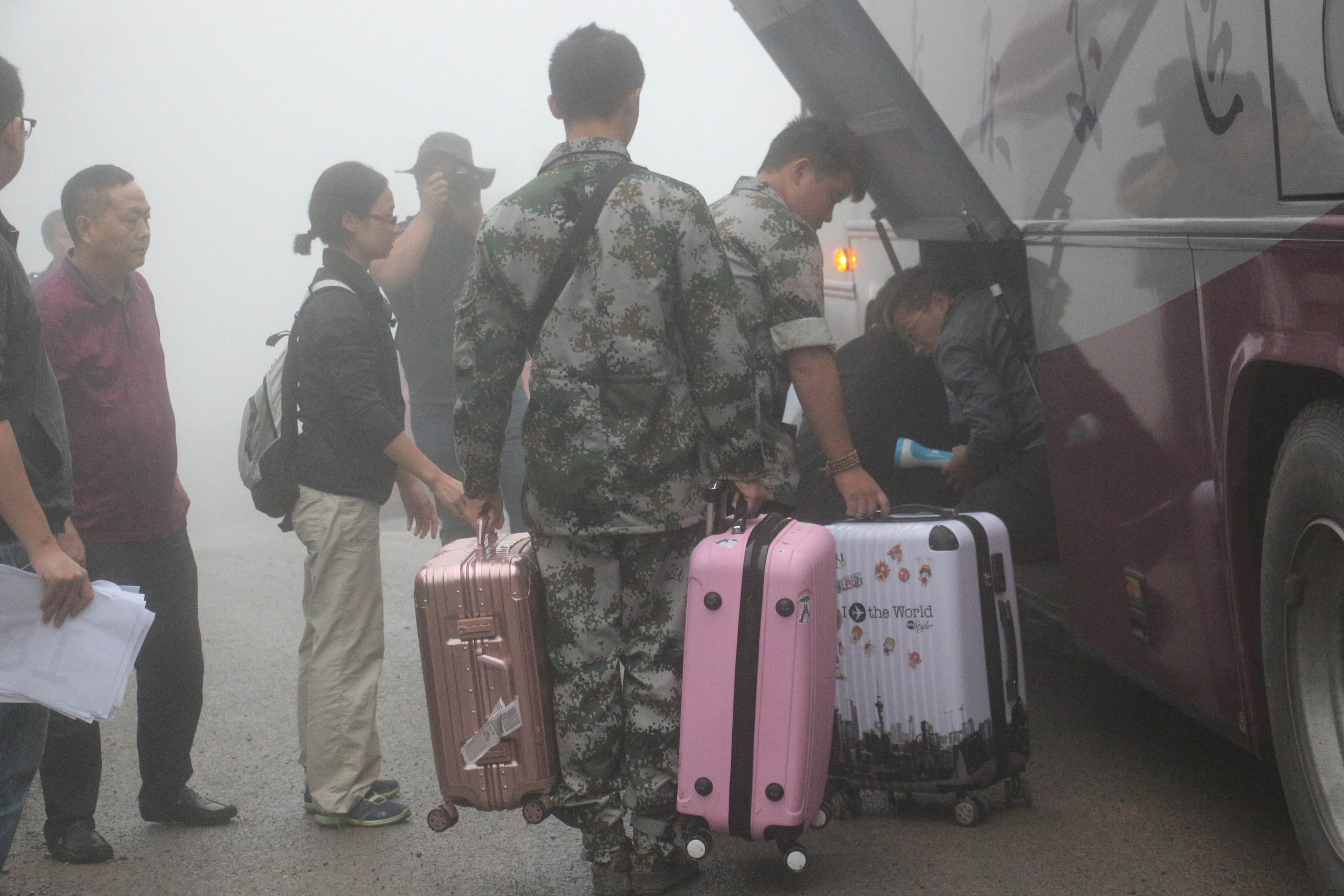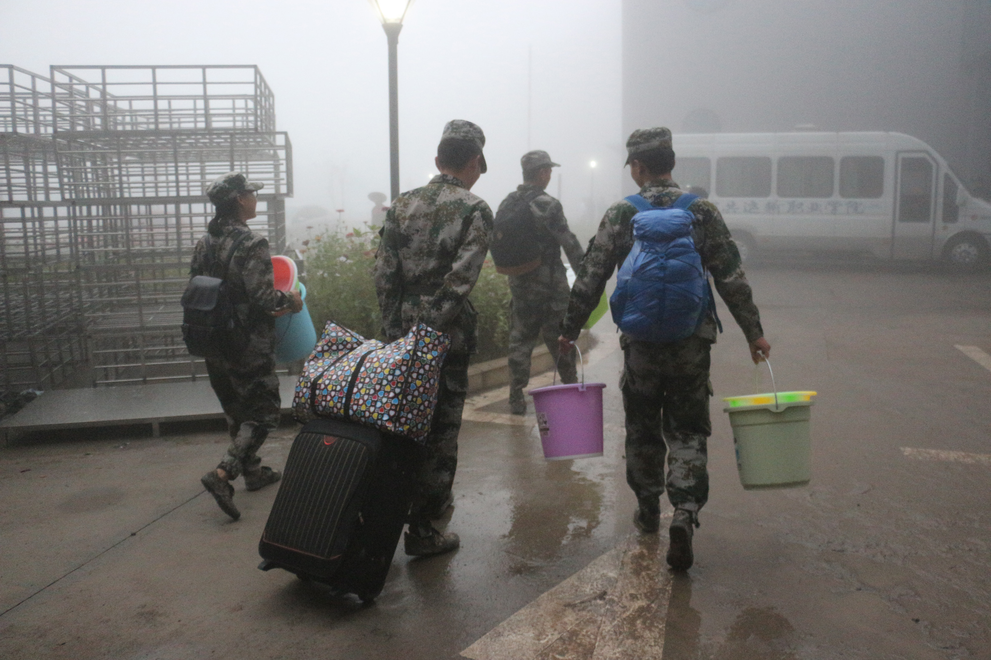 24日的古剑山,雾气非常重,能见度不超过十米,给返校的工作增加了难度。在这样的情况下,领导、老师、教官、学生干部协同组织,共同为学生们的平安返校而出力。