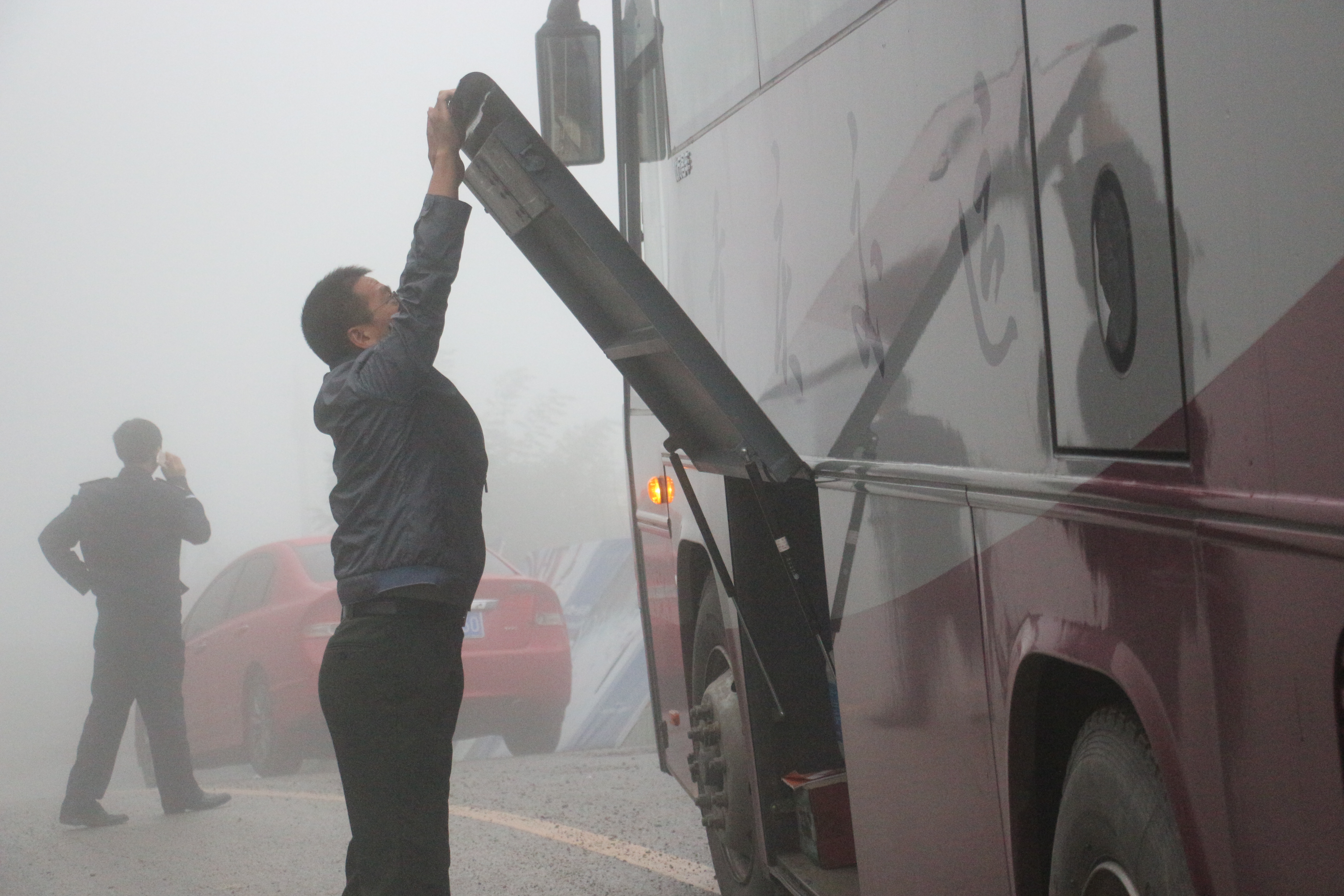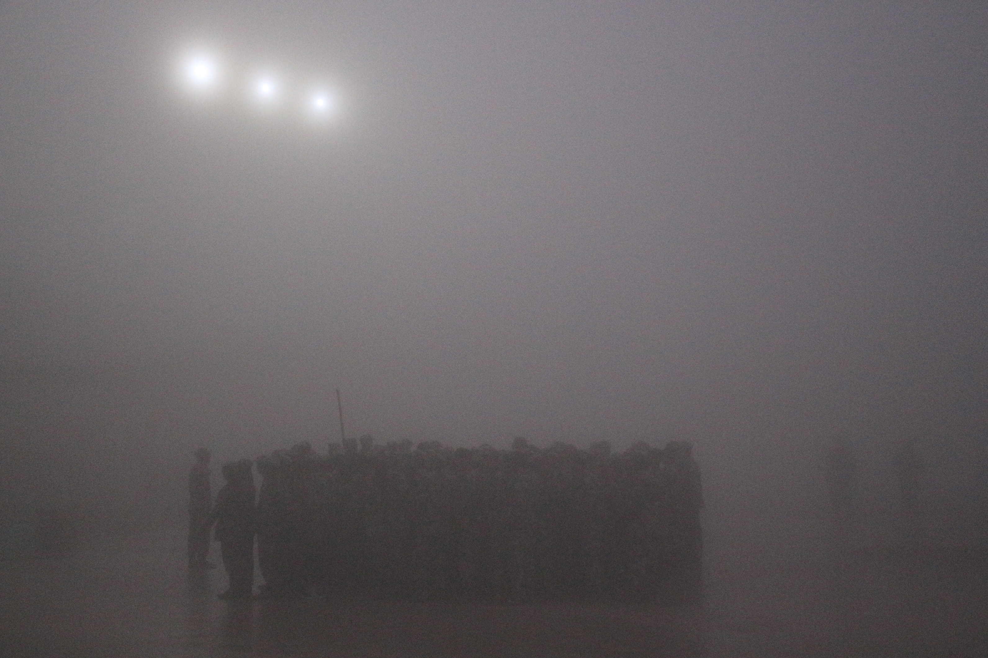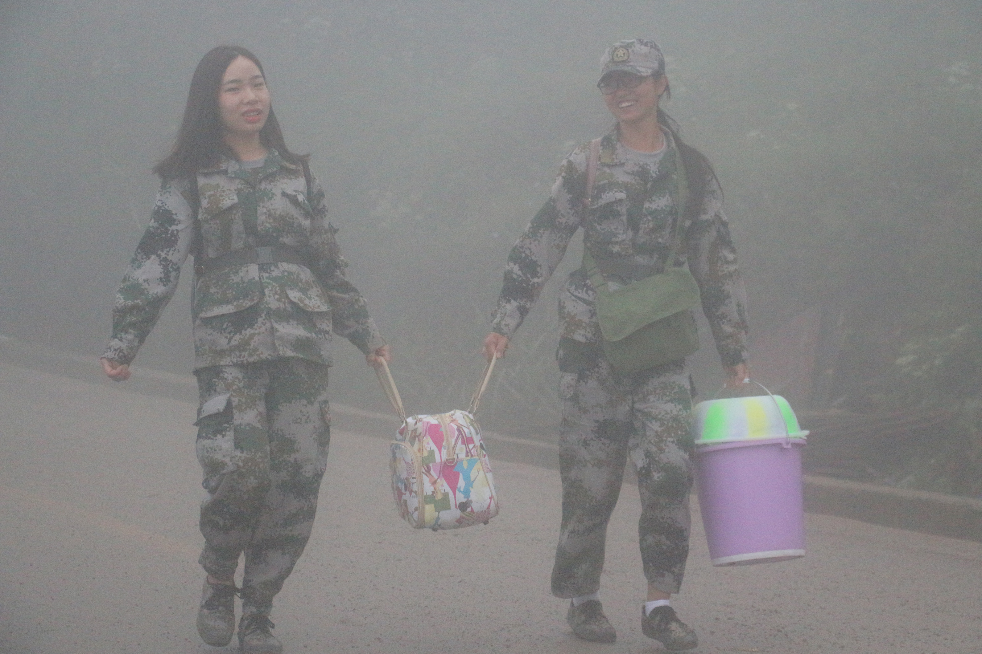 24日的古剑山,雾气非常重,能见度不超过十米,给返校的工作增加了难度。在这样的情况下,领导、老师、教官、学生干部协同组织,共同为学生们的平安返校而出力。