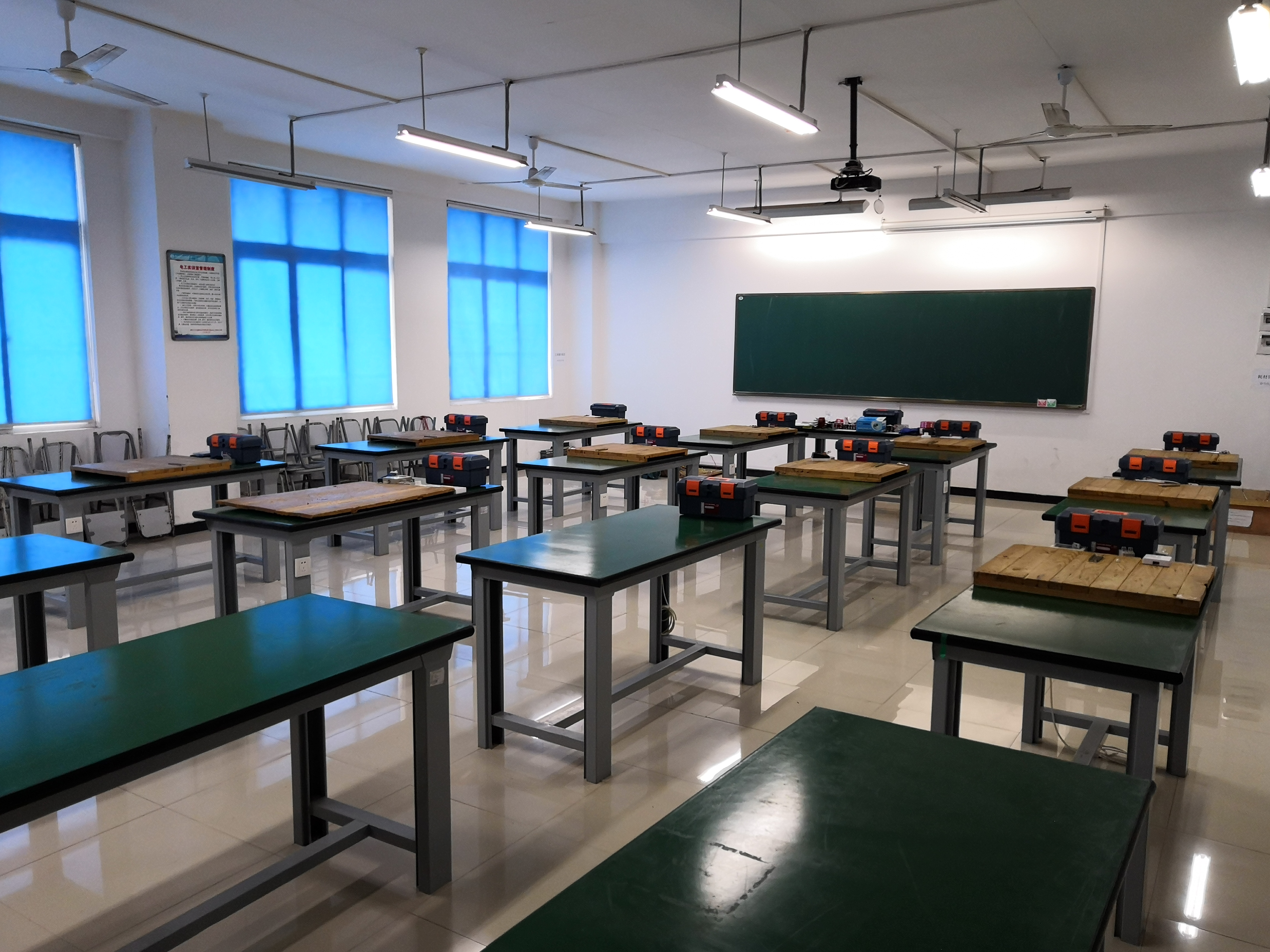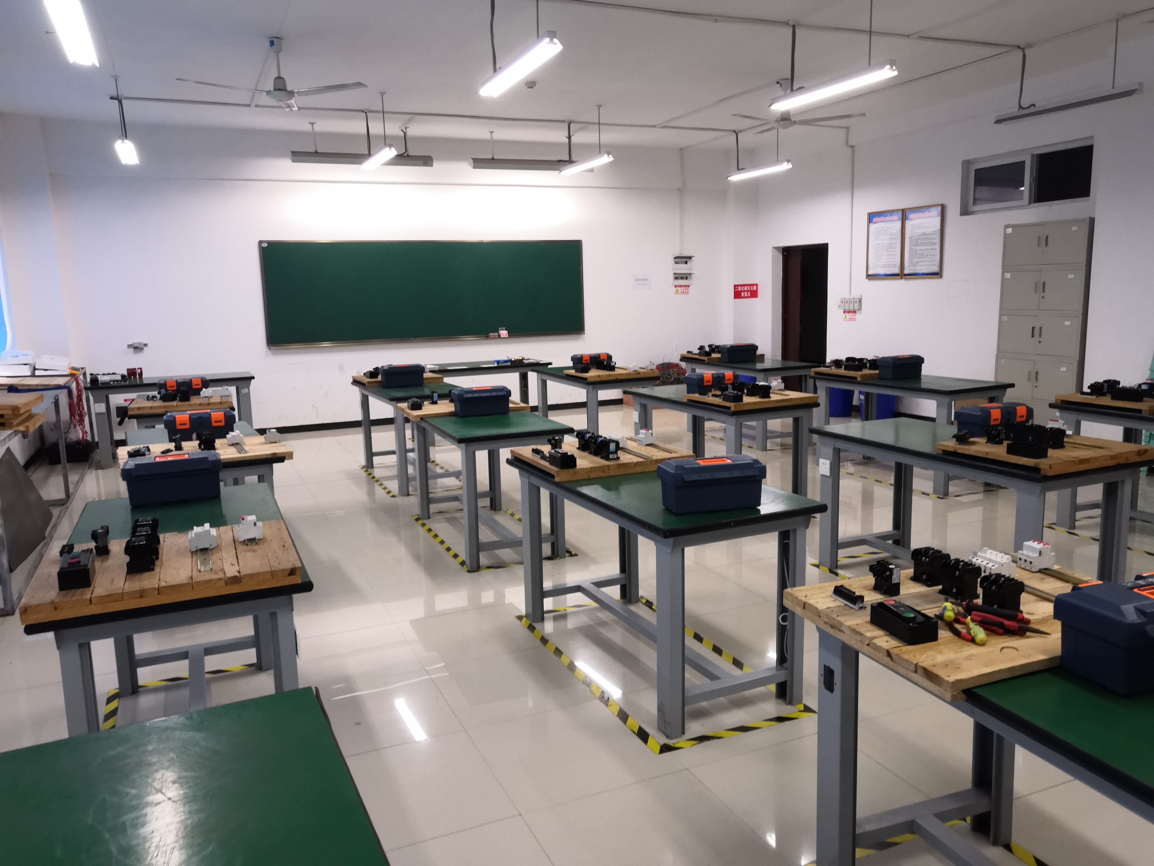 电工实训室分别为D402和D404,其中D402占地约110㎡,共64个工位,D404占地约105㎡,共64个工位,在电工实训室学生可熟悉各种工具及仪器仪表的使用,熟悉电工基础技能,掌握电气元件的识别安装及完成家庭电路安装等电工类相关实训项目。