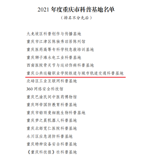 5月16日,重庆市科学技术局办公室发文公布2021年度重庆市科普基地名单,学校城市轨道交通与铁道交通科普基地榜上有名,被评为2021年度市级场馆类科普基地。