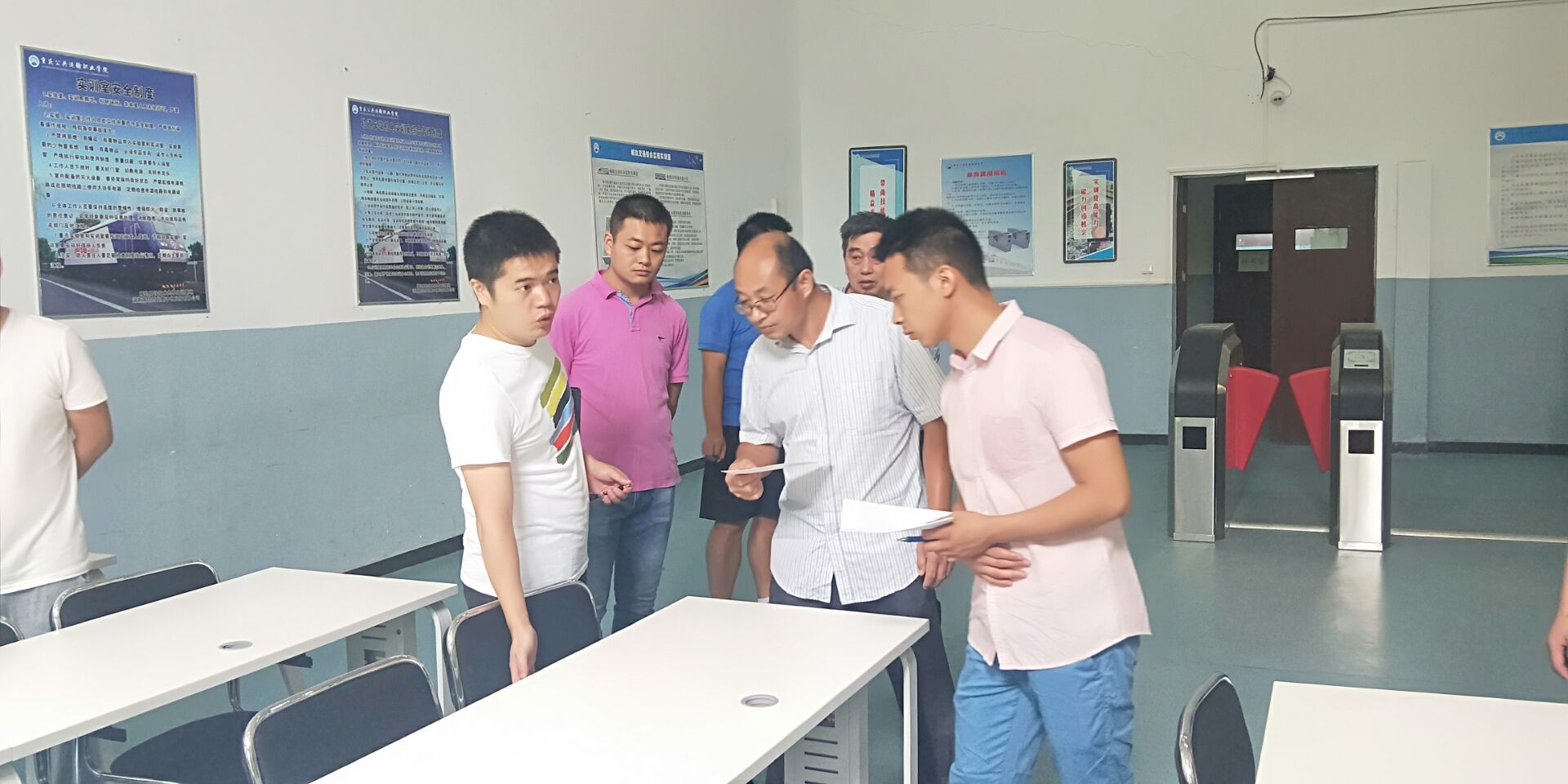 由周宗明主任和王德春主任带队,各个实训室管理人员参与对所有的实训室进行专项检查,在检查整个过程中,王主任指出,在安全方面,安全是基地的底线,也是红线,基地教师必须按照值班表做到每日的巡查,并汇报情况,一旦出了安全事故,基地教师必须采取相应的举措,做到及时送医、及时上报;基地教师必须明确并认真履行各自的岗位职责,并对各实训中心的开放时间、实训室的定期巡查与上报。