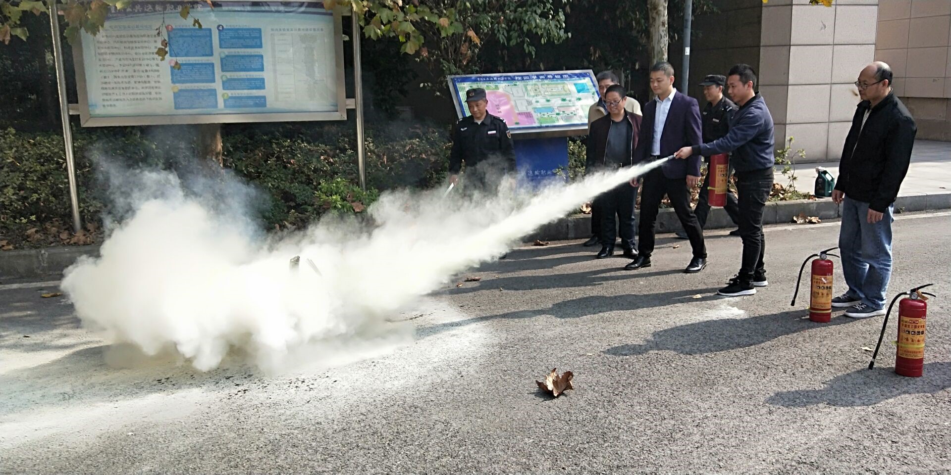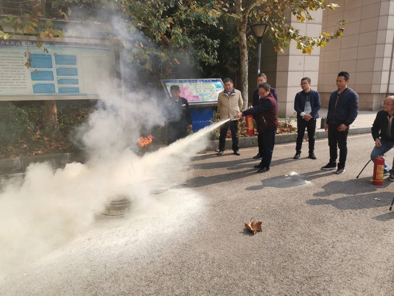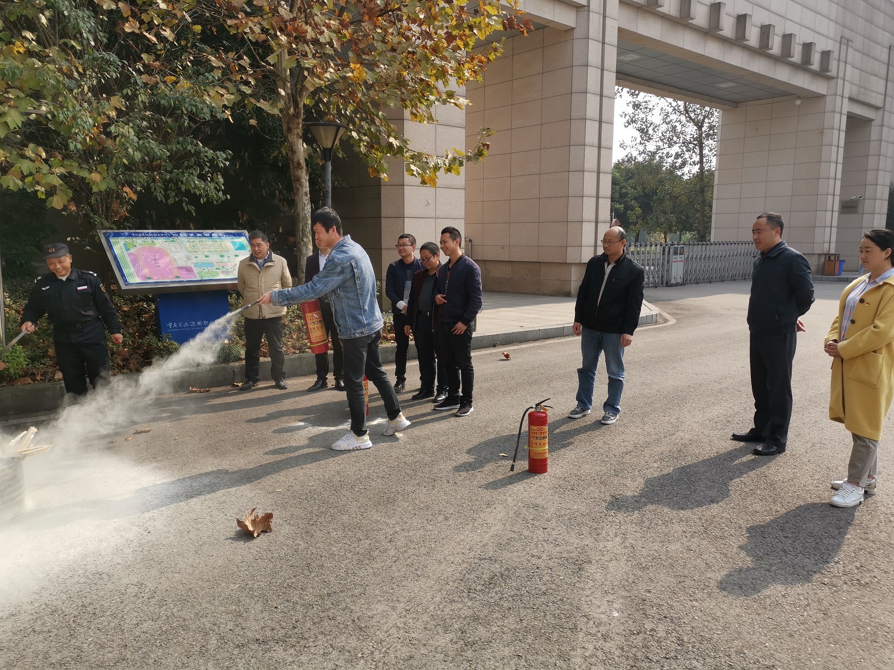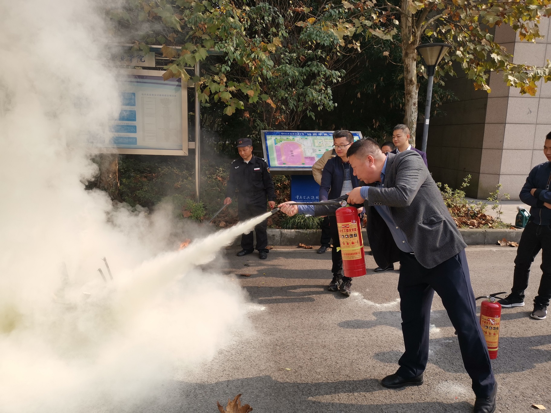 我部门联合学院安保处组织了一场仿真消防演练。在整个演练过程中,首先王德春主任先就实训室存在的安全隐患及可能出现安全事故的地方做了细致的讲解,并安排每位老师活动结束后检查实训室的安全隐患,防患于未然。其次,安保处杨华处长亲临现场为大家现场演示干粉灭火器和干冰灭火器的使用,并提醒大家使用干冰灭火器的时候一定注意自身安全。在确保安全的前提下,每位老师都对我们部门灭火器进行了使用。解决了老师们只知道理论知识没有动手实际操作的问题,各位老师也是学到了很多很有用的消防知识,相信这些知识对我们实训管理的老师们为以后的工作起到了很有力的保障。