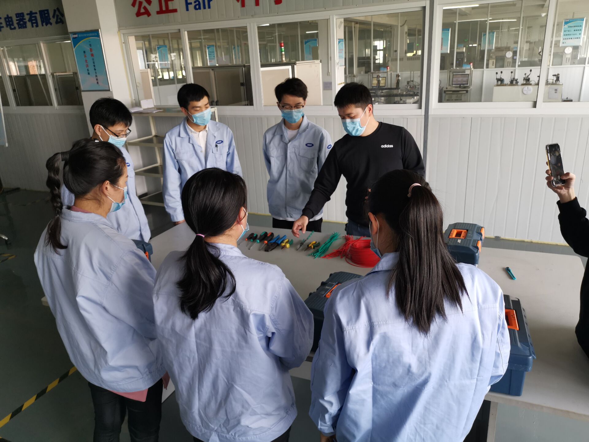 本次培训由学院维修电工大师工作室的成员为大明汽车电器有限公司的850名在职职工进行初级电工的职业技能培训。鉴于疫情特殊性,本次培训以线上理论培训和线下实操培训相结合的方式进行,其中,线上的理论培训长达近20小时,主要以直播和录播两种途径进行;线下的实操培训在做好充分的疫情防控措施的基础上,由维修电工大师工作室的成员前往企业所在地对员工的技能操作进行指导与讲解。