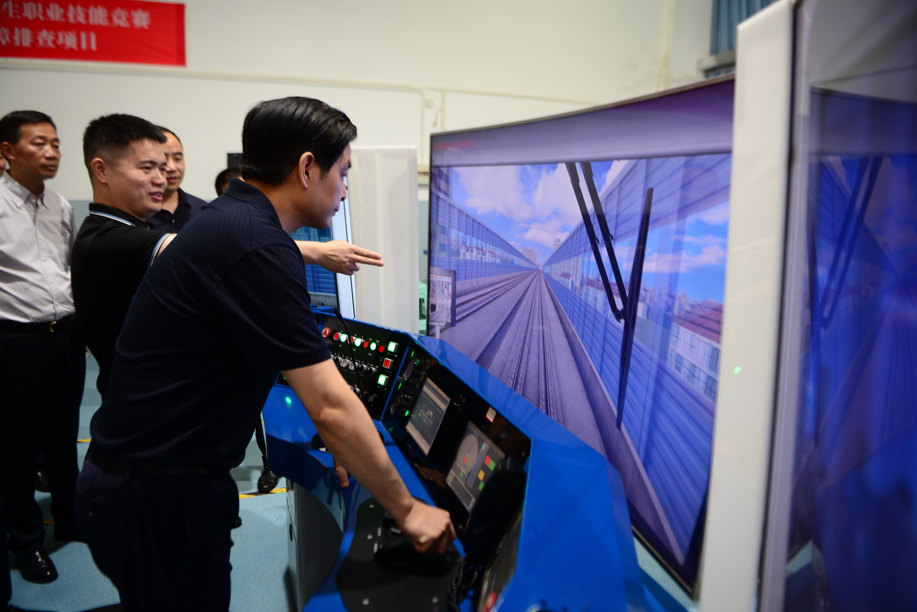 调研期间,在实训基地王德春副主任的介绍下,毛平一行实地考察虚拟仿真实训中心,查看动车组综合检修、城市轨道交通信号控制等20余个实训室(场),现场体验轨道(铁道)模拟驾驶,观摩城市轨道交通运营车辆调度沙盘演练。