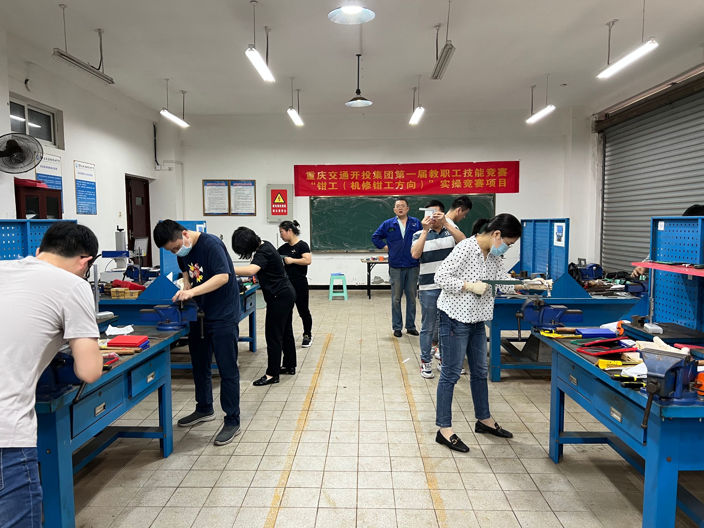 重庆交通开投集团第一届教职工技能大赛钳工赛项(机修钳工方向),5月11日下午在学校主校区金工实训室举行,经过比拼,比赛一等奖由智能装备学院向军老师夺得,另有5名教师分获比赛二、三等奖。
