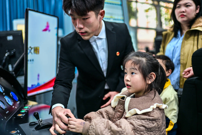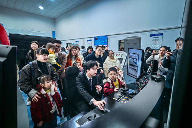 在模拟驾驶体验环节,孩子们坐在模拟器“驾驶员”位置,跟着学生志愿者学火车“驾驶”。看着模拟装具前端显示屏上的“列车”在自己的手上启动、运行时,她们感觉自己变成了“小小轨道人”,脸上无不露出兴奋、喜悦之情。
