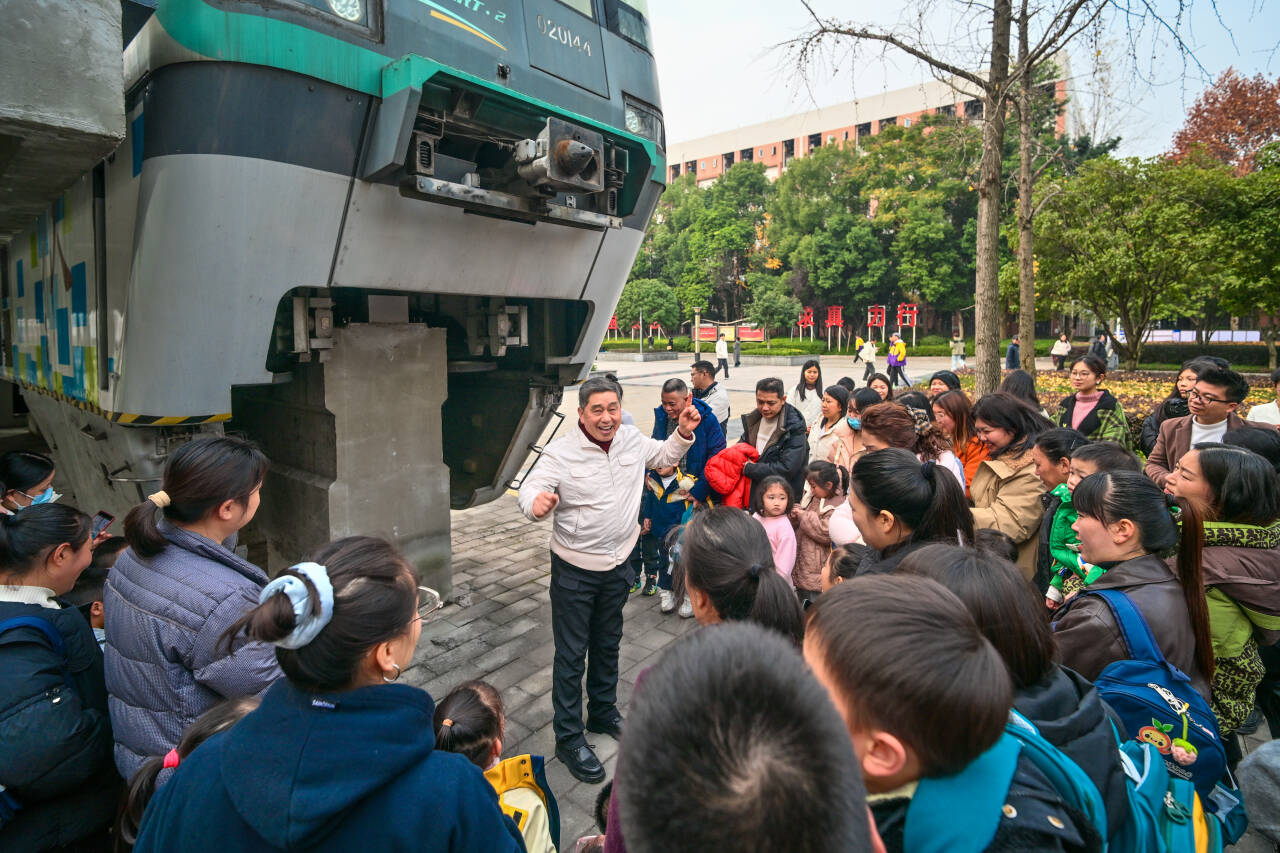 这和我家里交通主题绘本里的轨道几乎一样,今天在这里好像“走进”了绘本。看到校园里重庆轨道交通二号线“网红”跨座式单轨车辆等一辆辆漂亮的实装轨道、铁道实训车辆,有小朋友兴奋地说。