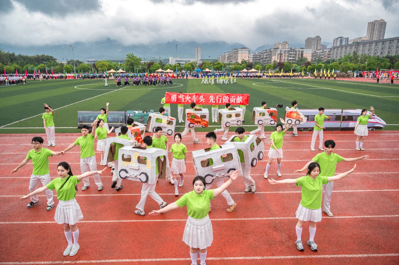 近日,重庆运输职院2025年春季运动会盛大开幕。轨道交通学院代表队60人组成的师生方队,身着统一服装,喊着铿锵有力的口号亮相开幕式,出场的精彩展示赢得现场观众阵阵掌声,尽显团结协作、积极向上的精神面貌。