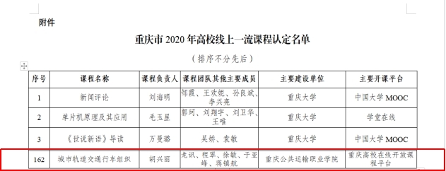 重庆市教委近日下发专门通知,公布2020年高校线上一流课程(精品在线开放课程)认定结果,重庆交通开投集团所属澳门正规电子游戏平台《城市轨道交通行车组织》成功入选。