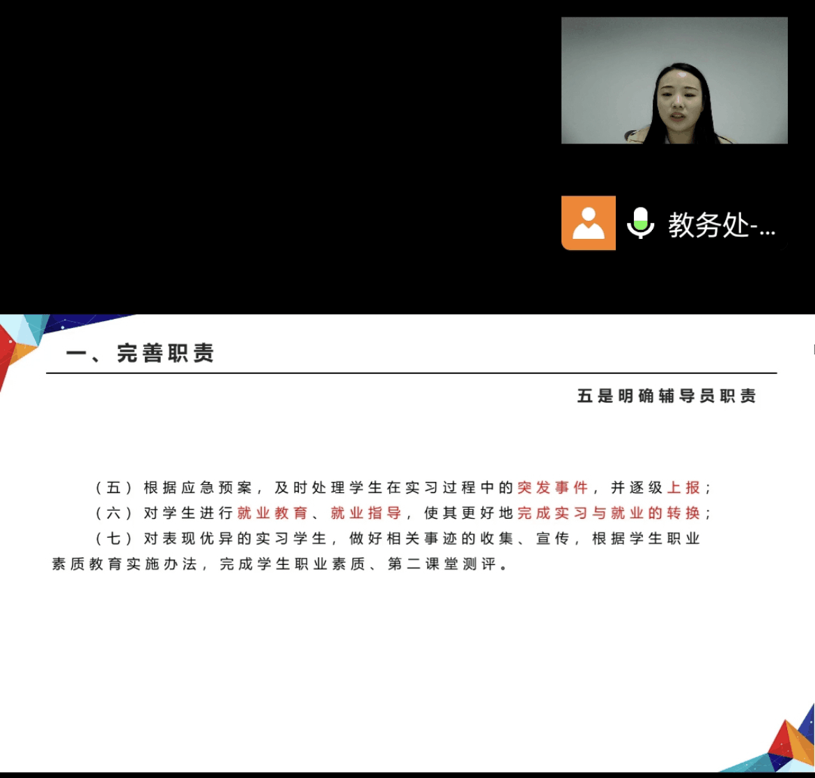 教务处 机构设置 规章制度 教学动态 服务管理 教学建设 下载专区 办事指南 教学动态首页 > 教务处 > 教学动态 > 教务处召开学生实习管理办法解读培训会 来源:教学动态发布时间:2022-10-17 16:20访问量: 10月12日13:30,教务处通过线上组织二级学院教学分管负责人、实习教学管理人员、全体实习指导教师共计135人,召开学生实习管理办法的解读培训会。解读了教育部《职业学校学生实习管理规定》,学校《学生实习管理办法》,正方软件技术人员对实习管理系统操作中常见问题进行了讲解和答疑。通过培训,让大家更深入的了解实习管理制度规定的实质内涵,进一步熟悉了实习管理系统的操作,夯实了学生实习管理的基础。