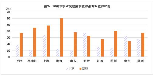 专兼结合的“双师型”队伍建设进展明显。督查发现,上海、安徽、贵州三省市中等职业学校兼职教师占专业教师的比例超过30%;上海、浙江、黑龙江、四川四省市高等职业院校兼职教师占专业教师的比例在40%以上(见图3);山东、黑龙江省 “双师型”教师的比例分别达到67.3%和67.1%。