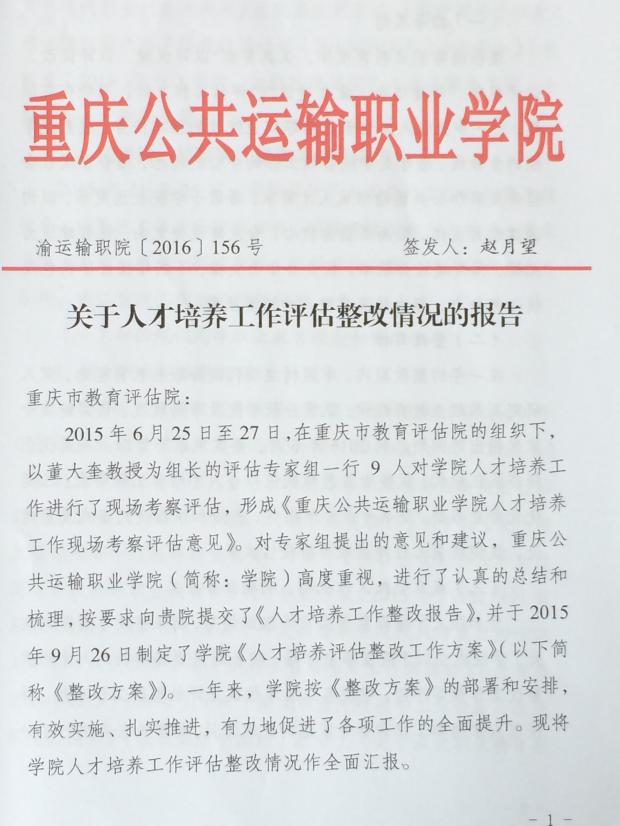 2016年7月5日,以重庆市高等职业院校人才培养工作评估专家委员会主任张宗荫教授为组长的评估整改回访复查工作组一行7人,对我院人才培养工作一年来的评估整改情况进行了回访复查。