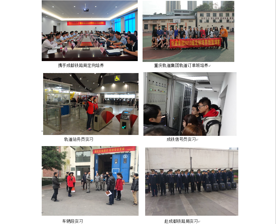 学院充分利用国企办学优势,先后与重庆轨道集团、成都铁路局重庆电务段、重庆西站、重庆长客轨道车辆有限公司等多家知名企业签署了校企合作协议,校企共同定向培养,先就业再培养,就业有保障。企业将为学生提供就业、岗位培训及顶岗实习场所。
