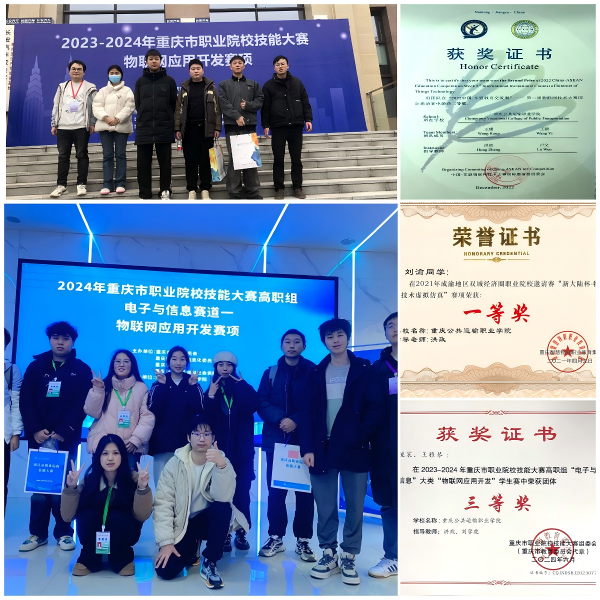 教学成果显著,学生在专业技能竞赛中屡获佳绩。近几年分别在全国物联网技能大赛、振兴杯青年职业技能大赛物联网安装调试员、中华人民共和国技能大赛重庆市选拔赛物联网安装调试员分别荣获一、二等奖,充分展现了学生扎实的专业功底与创新能力,也彰显了本专业卓越的教学质量与人才培养成效。
