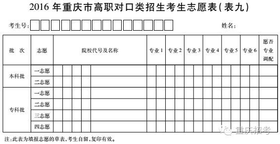 招生网 专业介绍 招生计划 招生政策 热点问答 录取查询 招生政策首页 > 招生网 > 招生政策 > 2016年重庆市普通高校高职对口类招生考生志愿表(模拟表) 来源:招生政策发布时间:2016-06-22 12:51访问量: