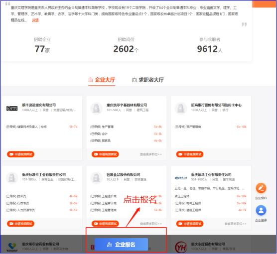 电脑端登录访问报名网页huibo.cn/XxDYP——点击下方“企业报名”——完成注册(已注册的请直接登录)——点击“增加职位”发布招聘岗位——勾选提交报名——完成视频面试时间设置——等待学校审核——活动当天完成面试。