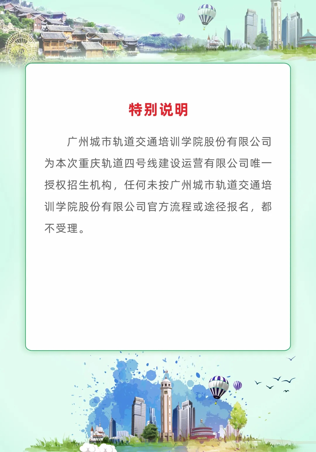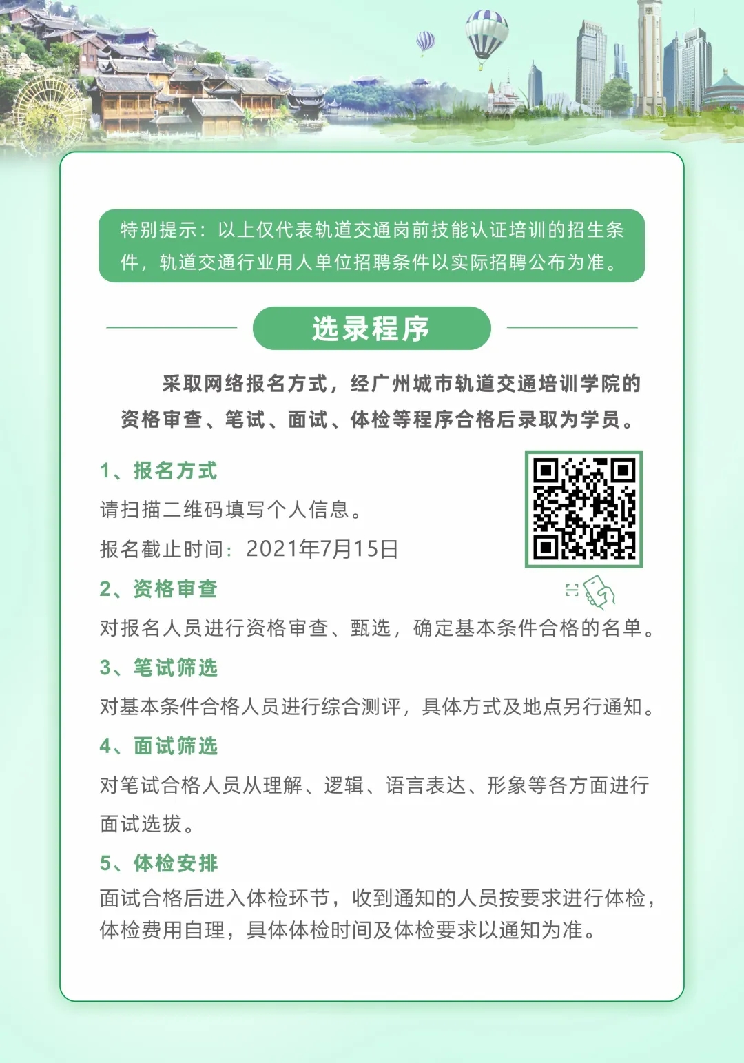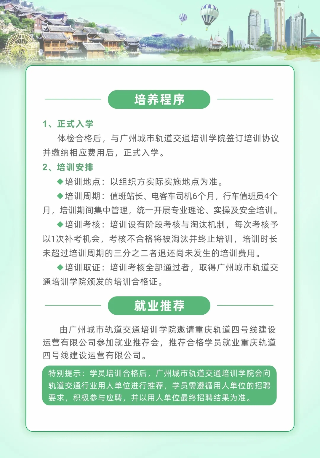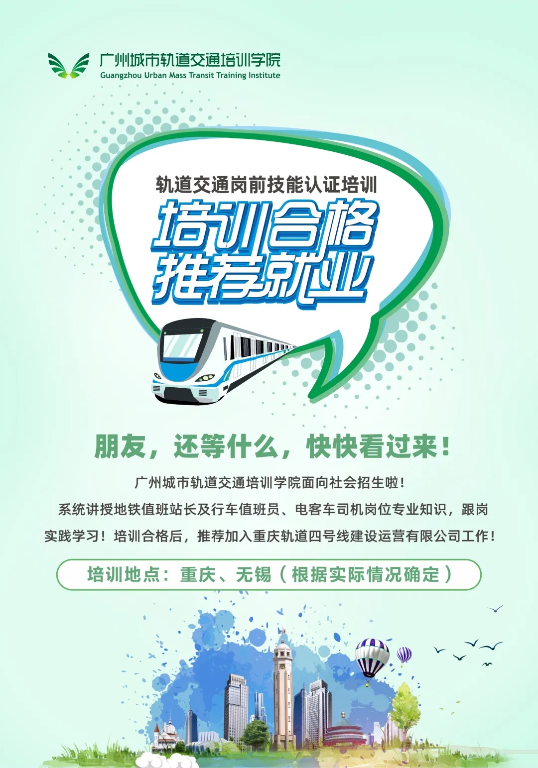 创业就业网 焦点新闻 通知公告 招聘信息 就业技巧 能力测试 就业政策 职场人生 众创空间 创业指导 办事指南 校企合作 就业之星 下载专区 通知公告首页 > 创业就业网 > 通知公告 > 轨道交通岗前技能认证培训招生信息 来源:通知公告发布时间:2021-07-06 09:51访问量: 免责声明: 1.以上内容转载自“广州城市轨道交通培训学院”微信公众号,版权归原出处所有(如涉侵权,请联系我们删除); 2.广州城市轨道交通培训学院系重庆轨道四号线公司股东之一,此次培训招生是企业自有运作模式与电子游戏无牵涉; 3.电子游戏为向毕业生争取更多的就业机会,故转发此信息供毕业生自主选择; 4.学校纯属信息转载,不收取毕业生任何费用。