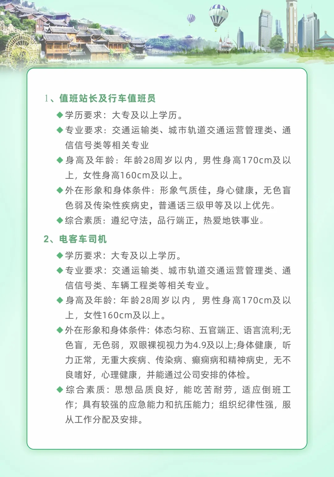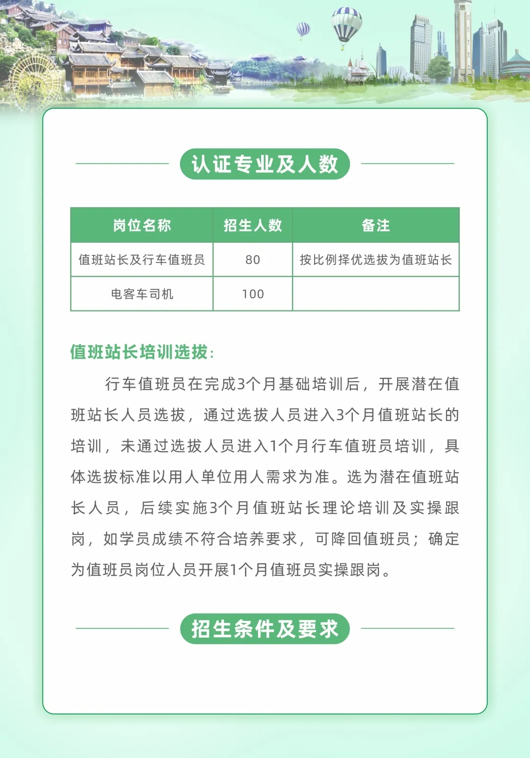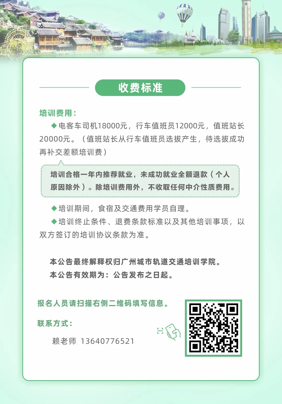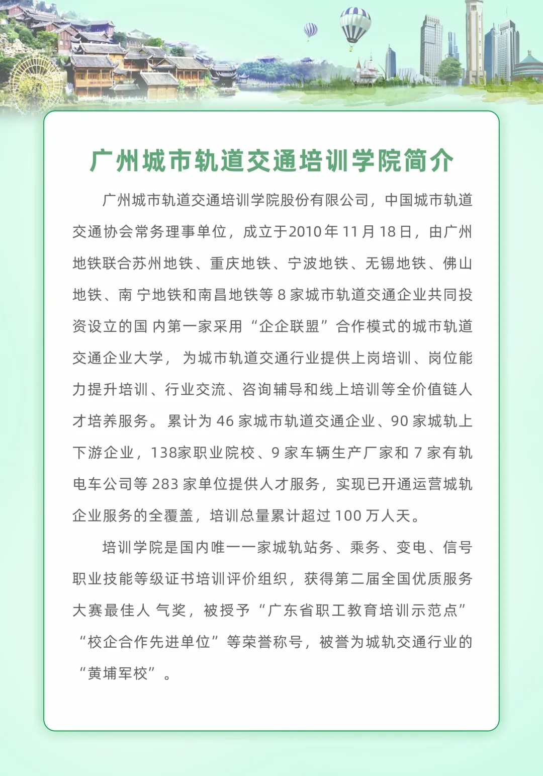 创业就业网 焦点新闻 通知公告 招聘信息 就业技巧 能力测试 就业政策 职场人生 众创空间 创业指导 办事指南 校企合作 就业之星 下载专区 通知公告首页 > 创业就业网 > 通知公告 > 轨道交通岗前技能认证培训招生信息 来源:通知公告发布时间:2021-07-06 09:51访问量: 免责声明: 1.以上内容转载自“广州城市轨道交通培训学院”微信公众号,版权归原出处所有(如涉侵权,请联系我们删除); 2.广州城市轨道交通培训学院系重庆轨道四号线公司股东之一,此次培训招生是企业自有运作模式与电子游戏无牵涉; 3.电子游戏为向毕业生争取更多的就业机会,故转发此信息供毕业生自主选择; 4.学校纯属信息转载,不收取毕业生任何费用。