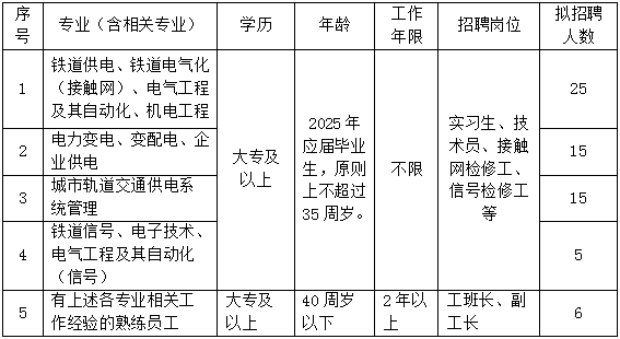4.2025 年应届毕业生,原则上不超过 35 周岁,有铁路或城市轨道交通供电系统相关施工及运营维保管理经验的社会人士可适当放宽条件。