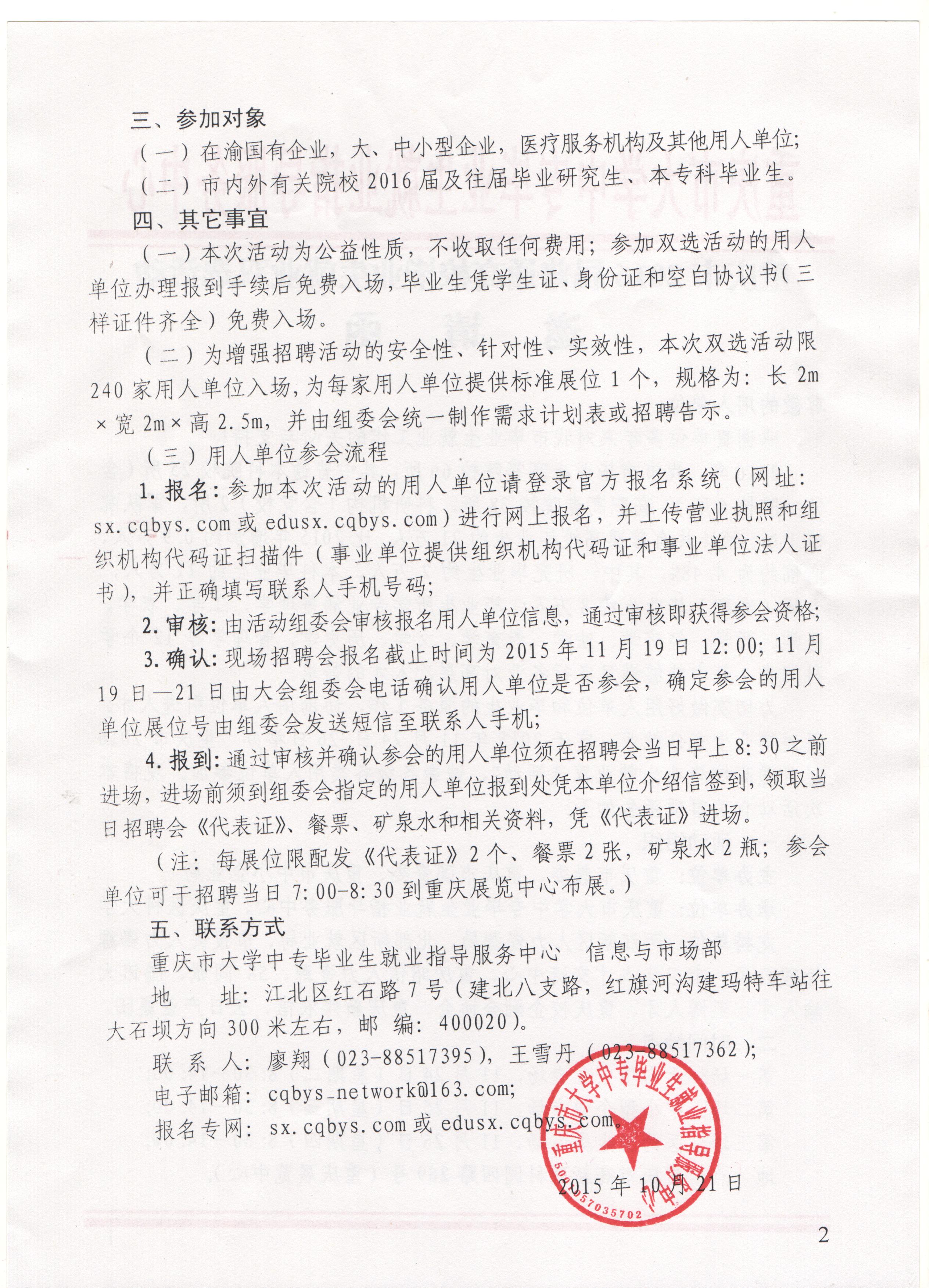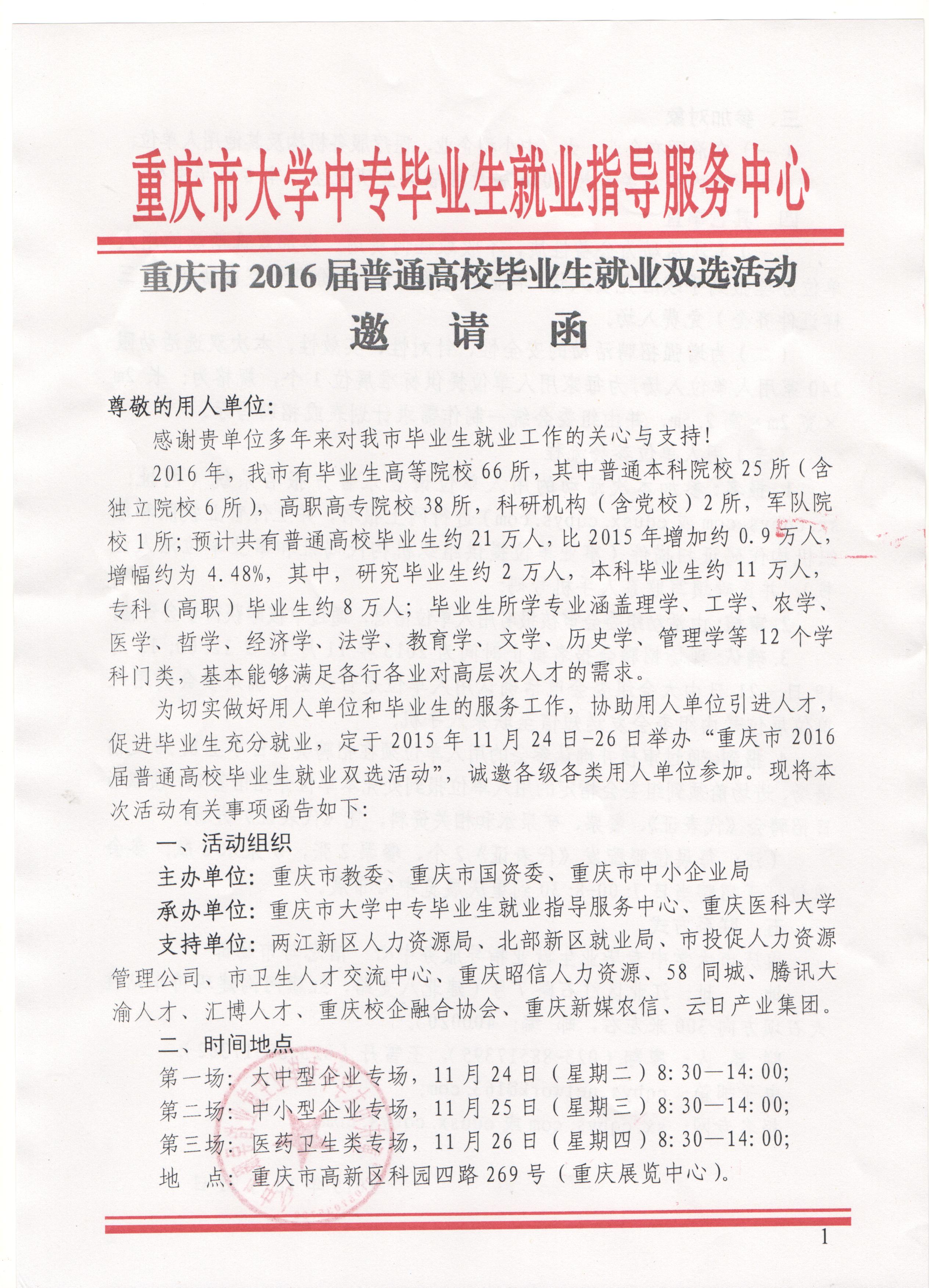 创业就业网 焦点新闻 通知公告 招聘信息 就业技巧 能力测试 就业政策 职场人生 众创空间 创业指导 办事指南 校企合作 就业之星 下载专区 招聘信息首页 > 创业就业网 > 招聘信息 > 市教委陈家坪大型双选会 来源:招聘信息发布时间:2015-11-17 14:21访问量: