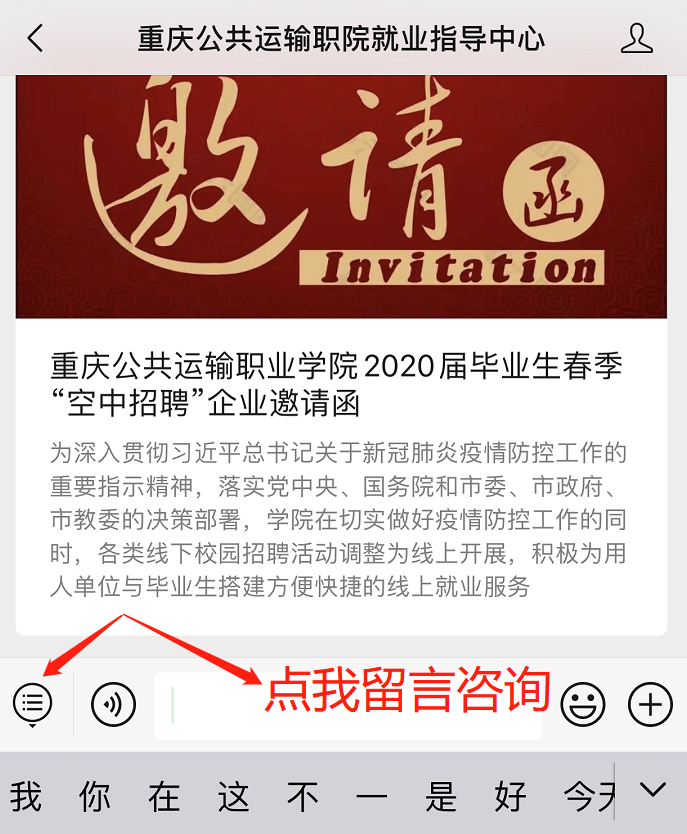 全天可咨询,学院就业指导中心专职老师将在24小时内给予咨询答复。关注“重庆公共运输职院就业指导中心”官方微信公众号,进入下方主页即可快捷留言咨询。